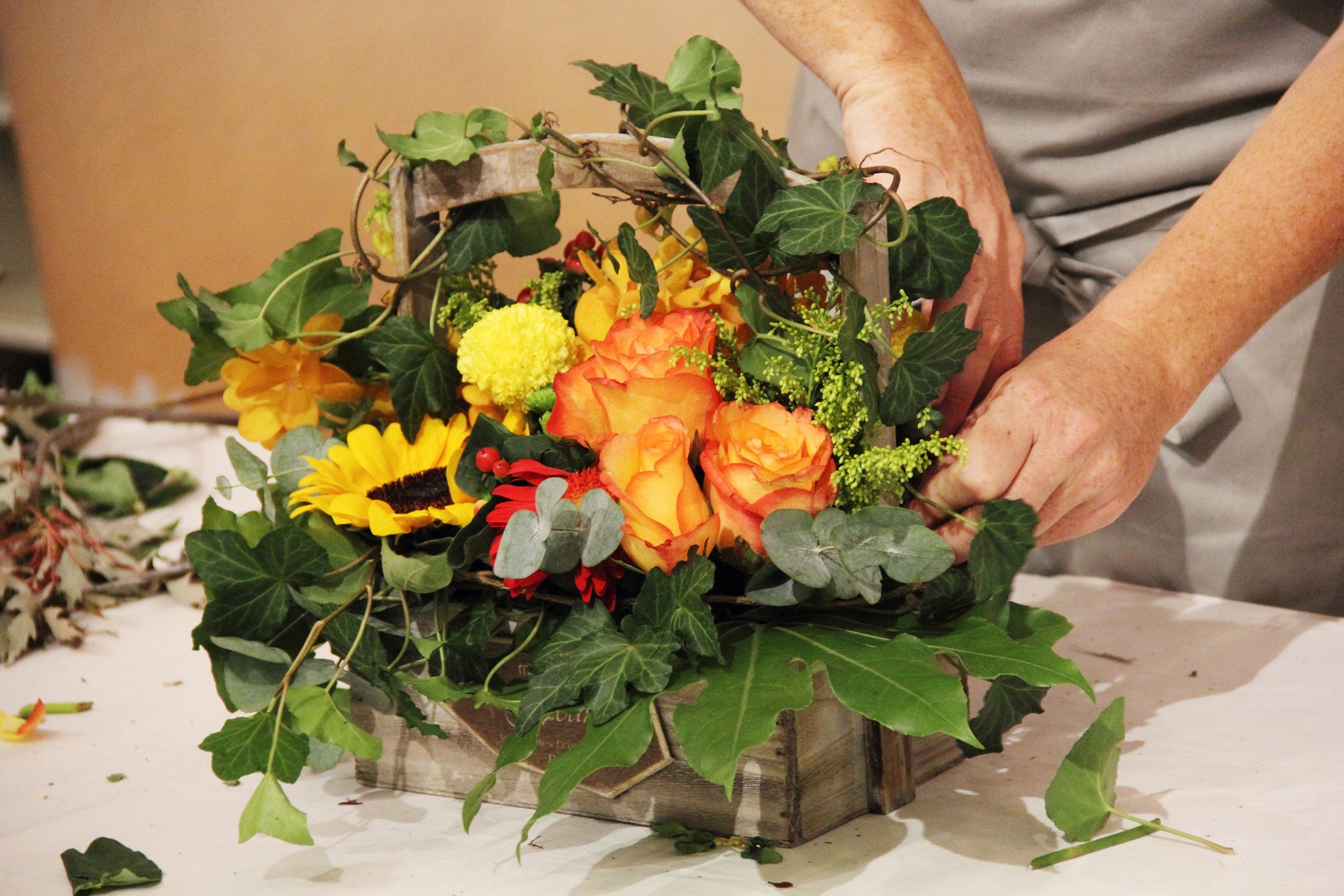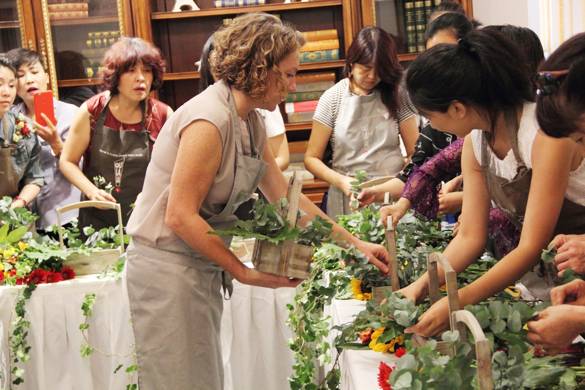她游刃有余的掌握著各式插花,顏色搭配得自然而有層次,美麗且大方。花藤、草蔓、花枝在她手中巧妙組合搭配。