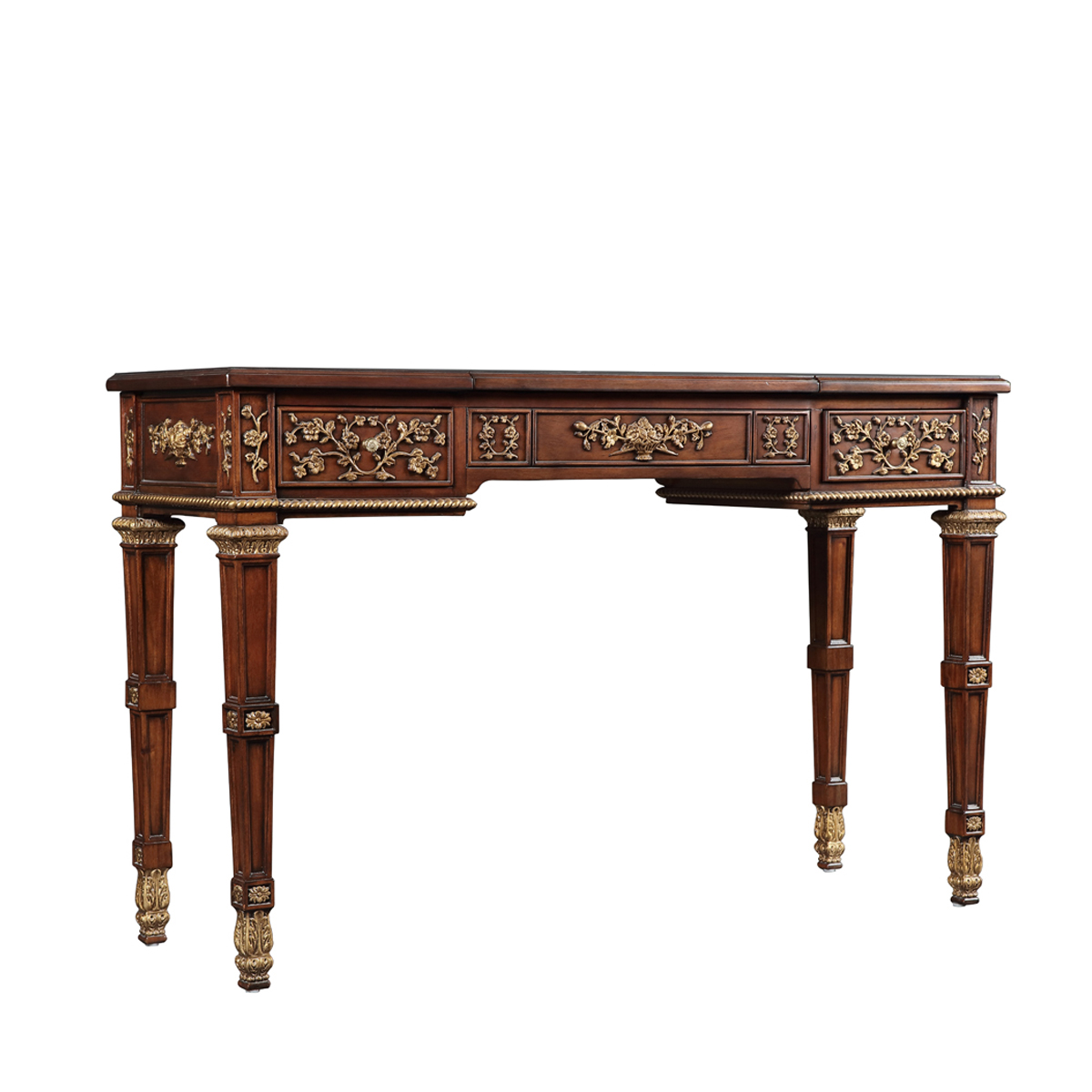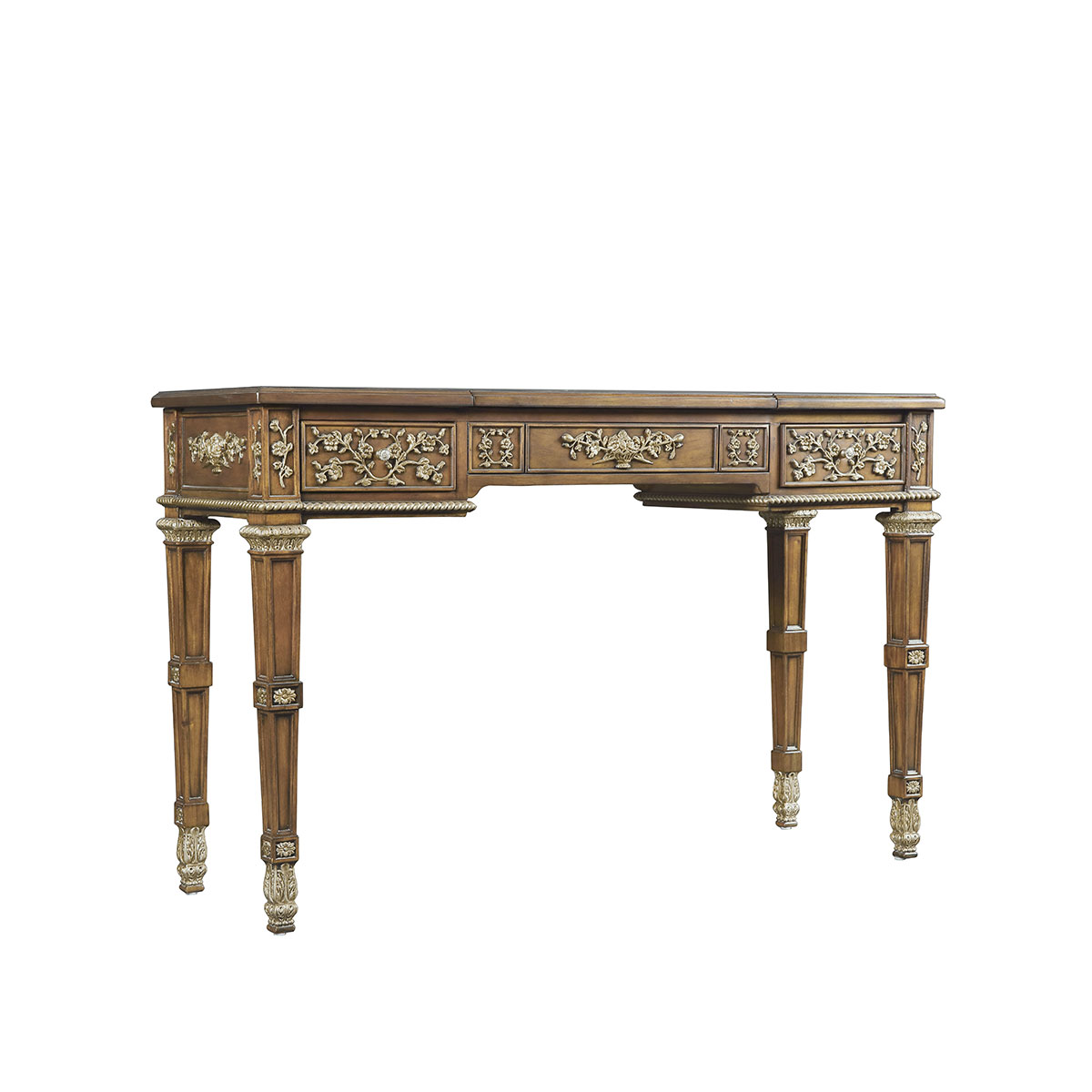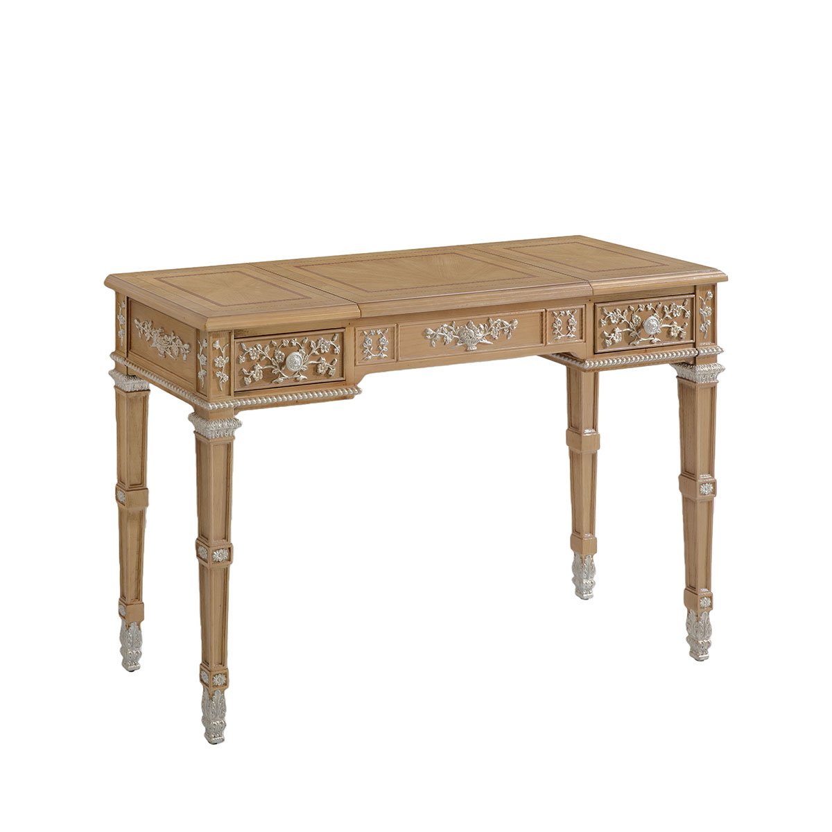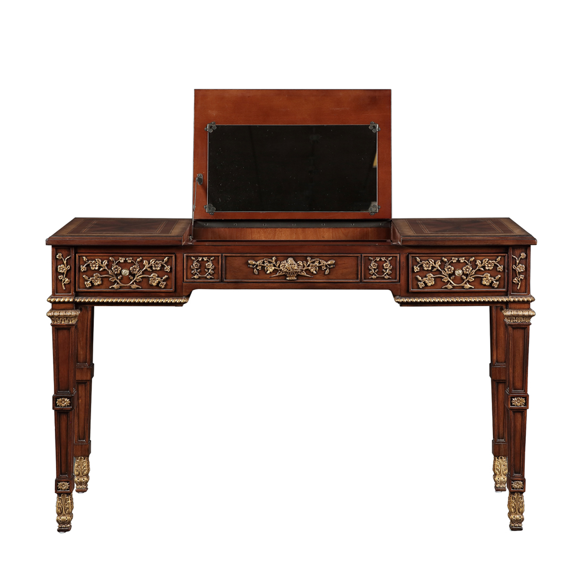 * 結實的連接技術以及描金的工藝 * 鏡子是鍍鋁鏡,始終保持鏡面清晰不會變形; * 三個儲物抽斗,其底部采用硬木實木滑軌; * 腳底部裝有可調腳釘;