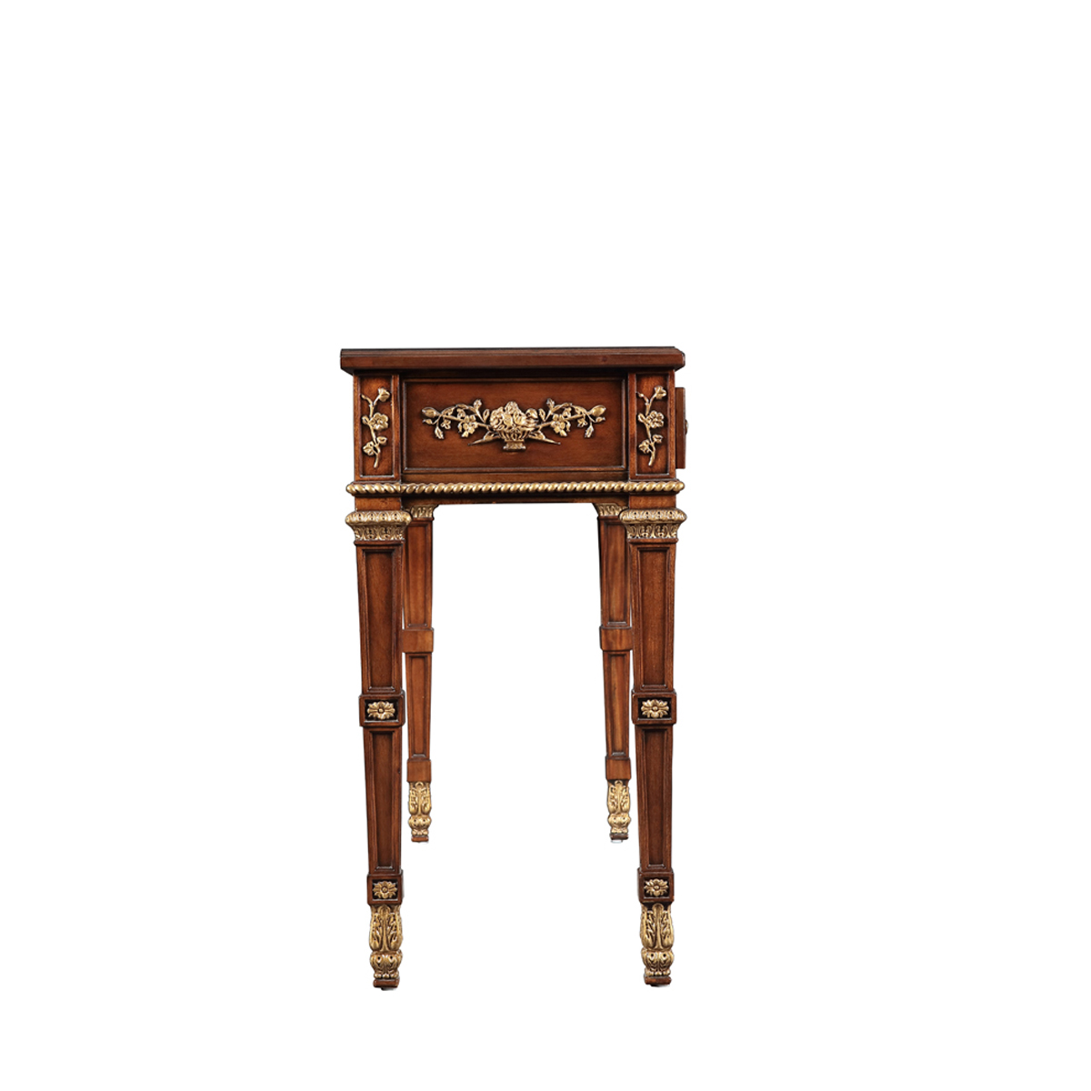 花草雕刻是安妮女王的園藝寫照,羅馬凹槽柱雕刻、貼金工藝都是匠心打造。貼仿金箔的璀璨光澤帶著決策者的尊貴威嚴,在細節處的精致彰顯生活的品質。