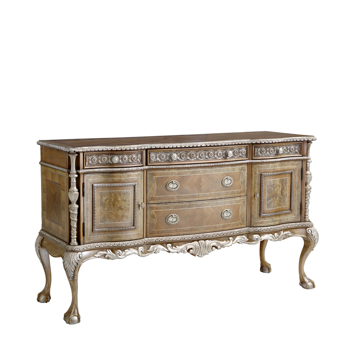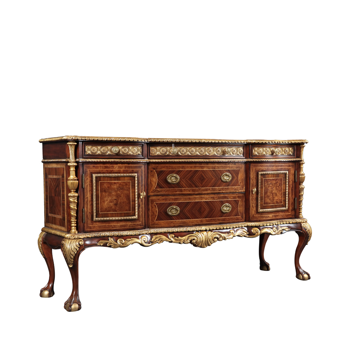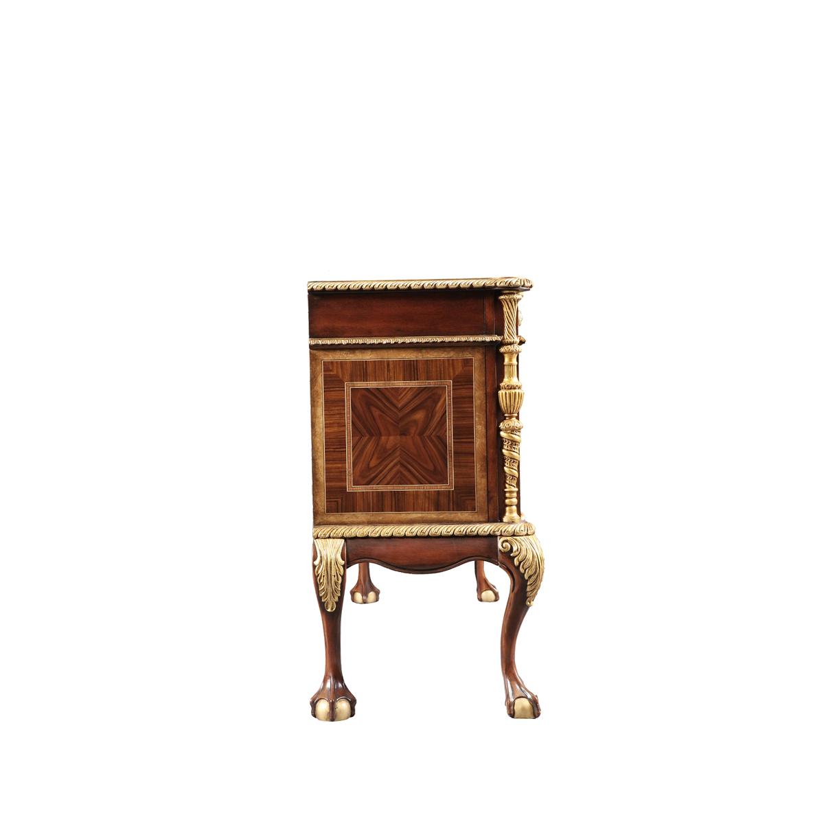 設(shè)計師從英國溫莎城堡中汲取設(shè)計靈感,靈動的裙擺輪廓勾畫莊嚴古雅的造型,采用材質(zhì)細膩而質(zhì)地優(yōu)良的桃花心木作基材,流暢的S曲線及爪球腳和層次豐富而紋理清晰的木皮拼花在墨綠色的斑駁古跡中釋放千年古韻。