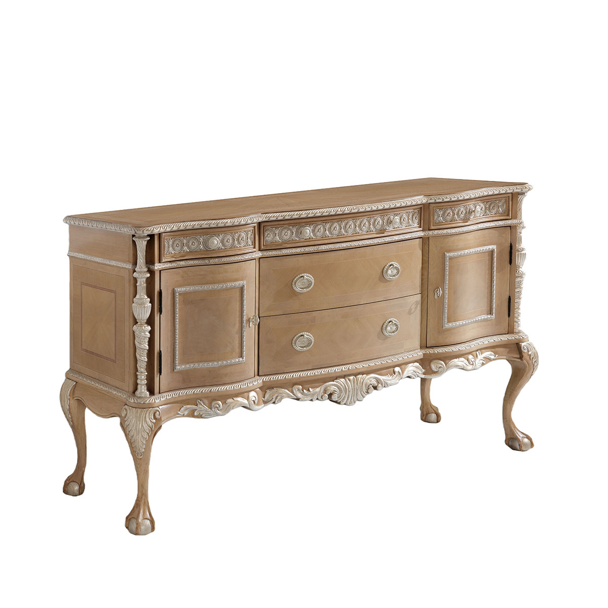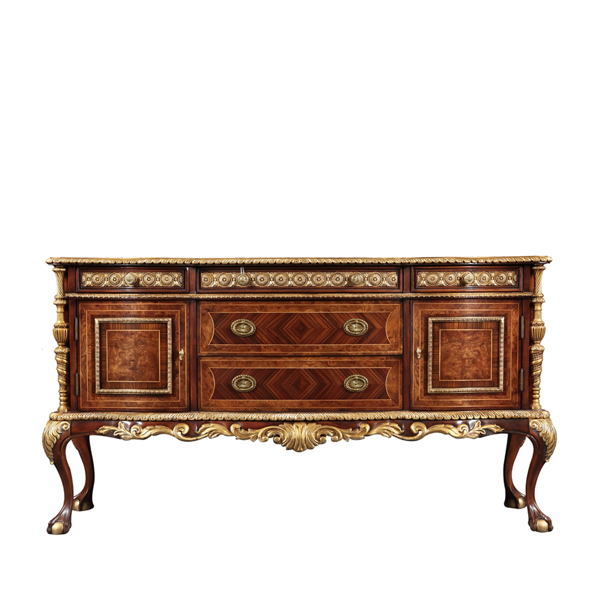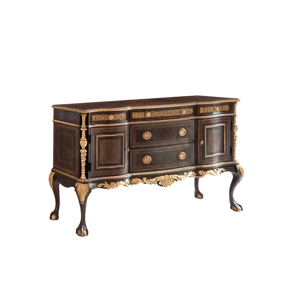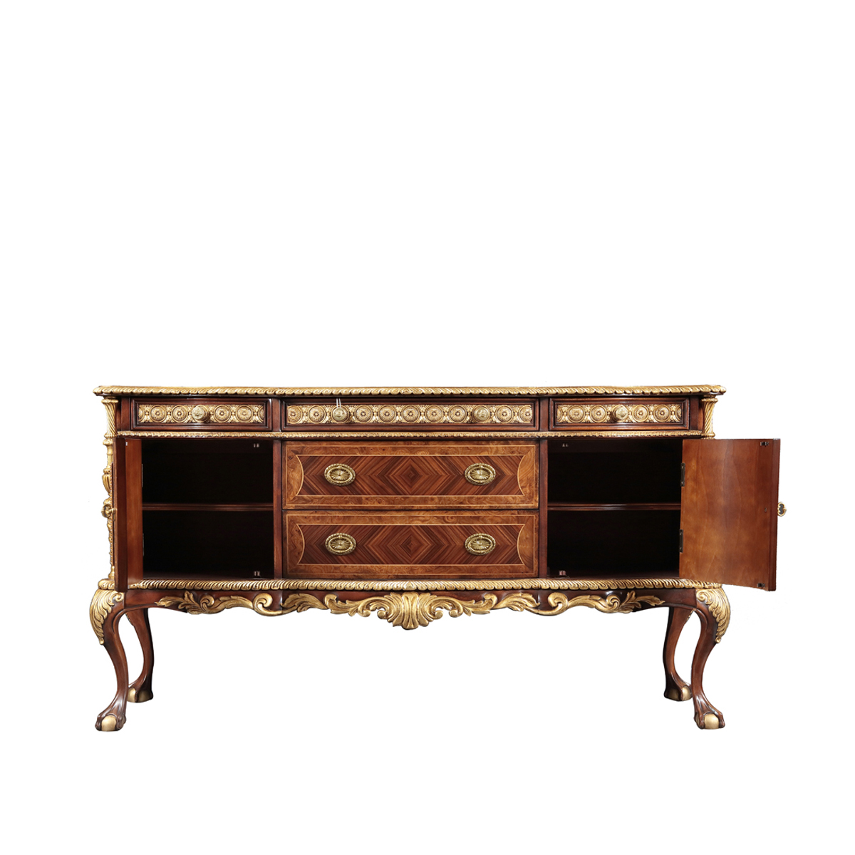 設(shè)計師從英國溫莎城堡中汲取設(shè)計靈感,靈動的裙擺輪廓勾畫莊嚴古雅的造型,采用材質(zhì)細膩而質(zhì)地優(yōu)良的桃花心木作基材,流暢的S曲線及爪球腳和層次豐富而紋理清晰的木皮拼花在墨綠色的斑駁古跡中釋放千年古韻。