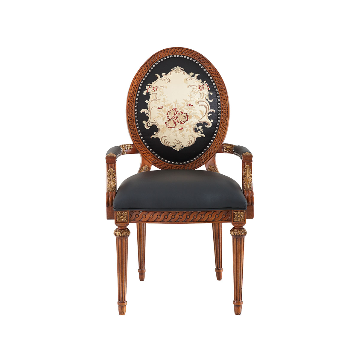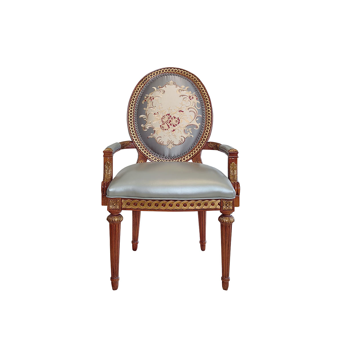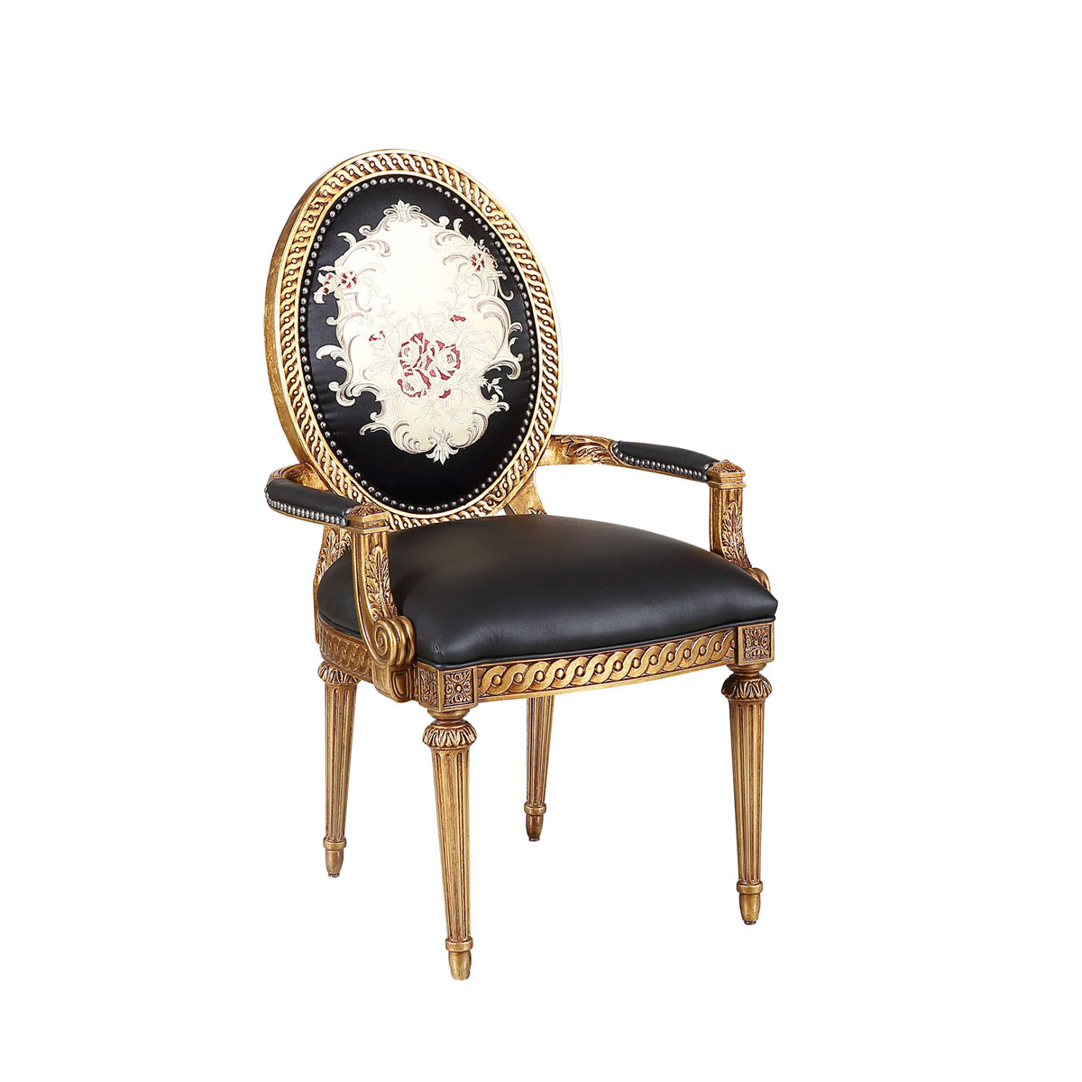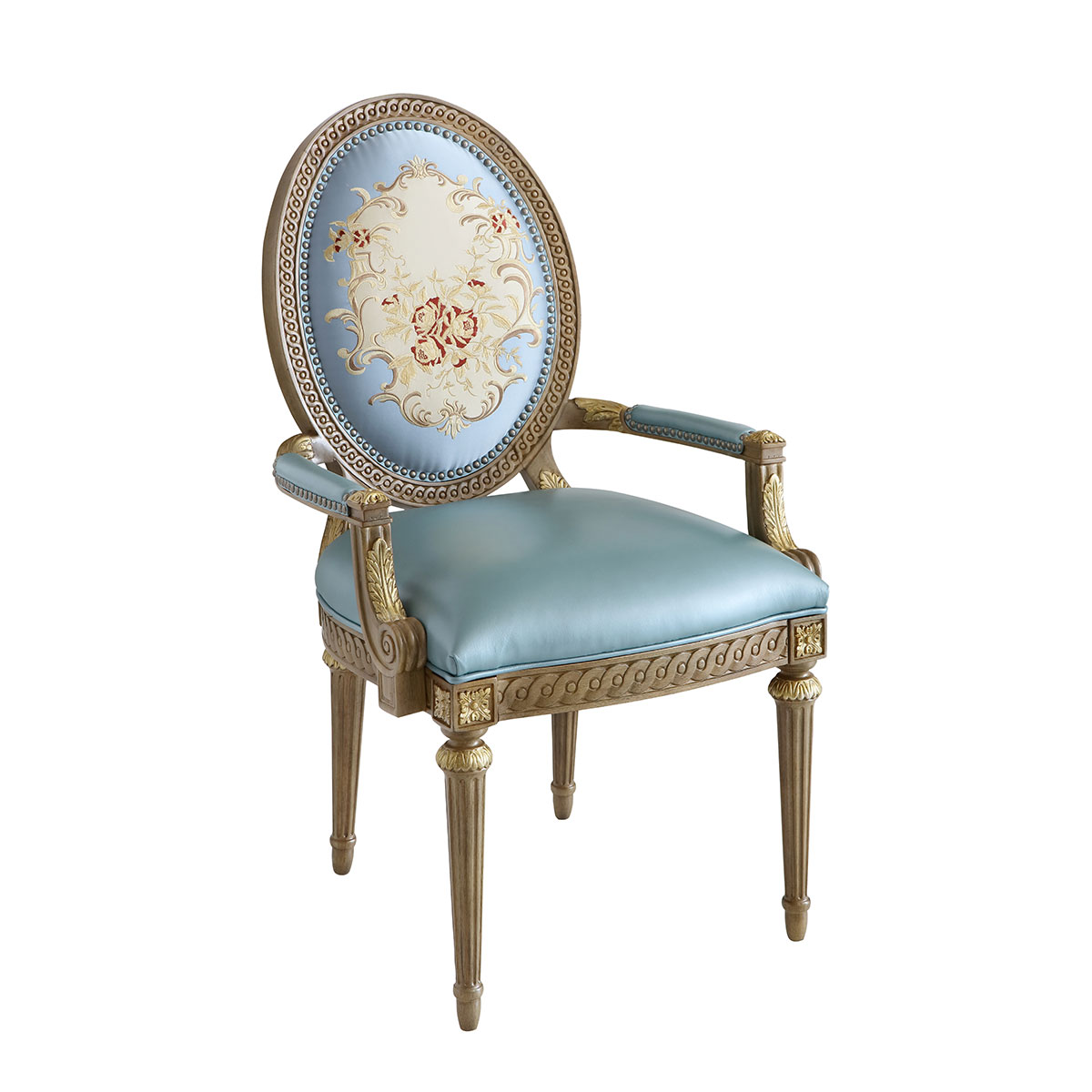 參考18世紀(jì)法國(guó)路易十六時(shí)期涂金扶手椅古董設(shè)計(jì),并結(jié)合同時(shí)期的圓面背板設(shè)計(jì)。配上精致的連續(xù)雕刻和貼金鉑工藝、錐形腳設(shè)計(jì)、觸感舒適的布藝和包有豐厚的填充物坐墊和靠背。