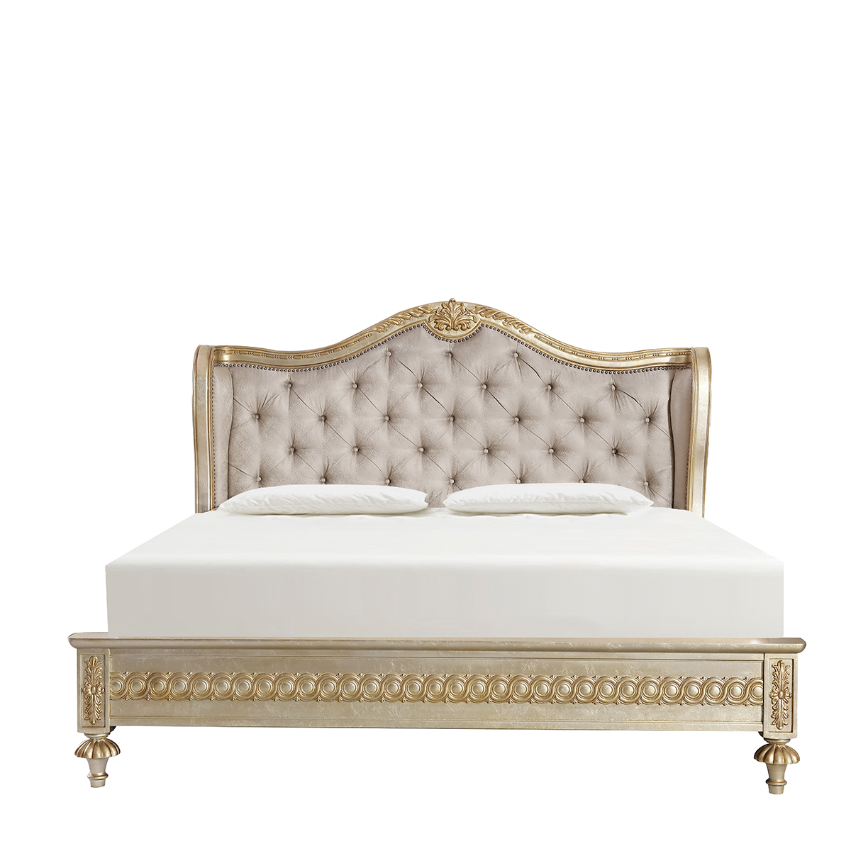 設計靈感源自法國浪漫奢華的凡爾賽宮,采用路易十四時期的太陽花連環雕刻和宛如翅膀擴展形狀的床頭板設計,配以實木花環和卷葉雕刻,表現凡爾賽宮的莊嚴;米黃色溫和的色調選擇,在莊嚴中帶來絲絲浪漫之意。