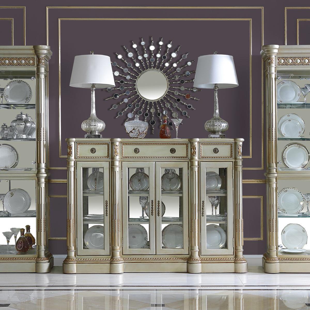 * 以法國路易十六時期的古董家具為設計基礎,采用同時期的建筑柱元素和耀眼奢華的網眼圖案、金箔貼飾,使其充滿了法式宮廷的優雅與華麗,充分詮釋了18世紀法式家具融合建筑與家具設計的藝術特點。