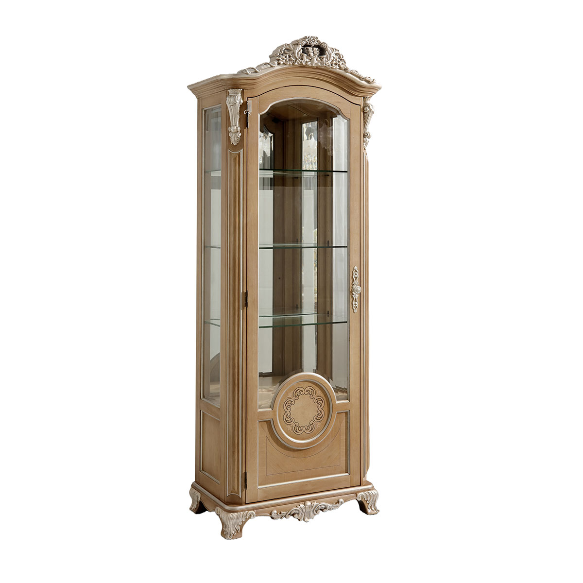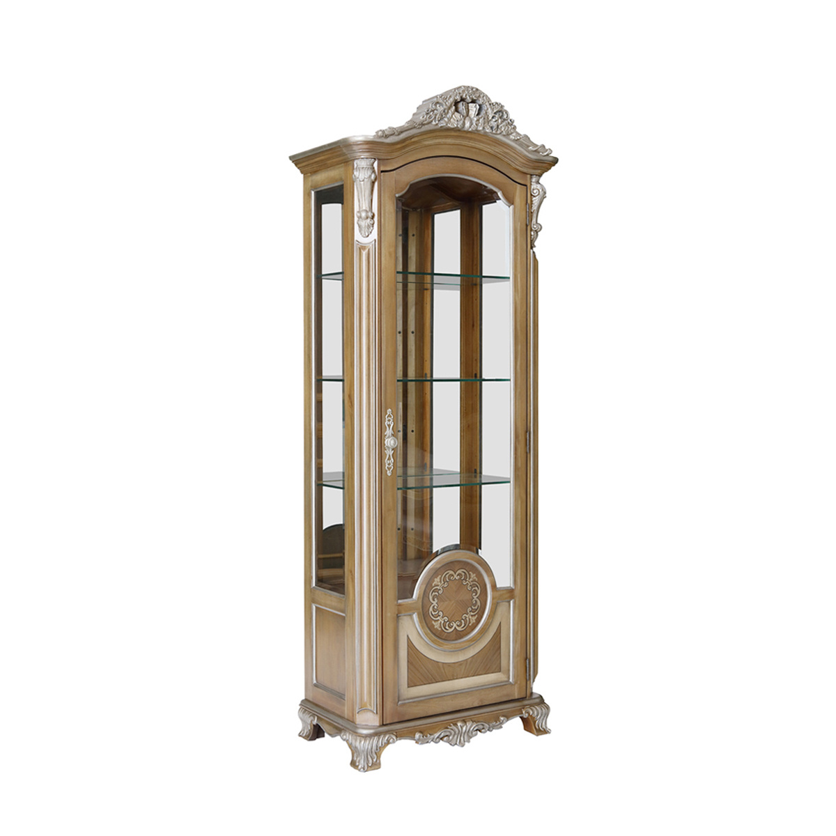 * 精致的手工雕刻細節(jié) * 實木框玻璃門,門內(nèi)有三塊玻璃層板; * 底部裝有可調(diào)層板;