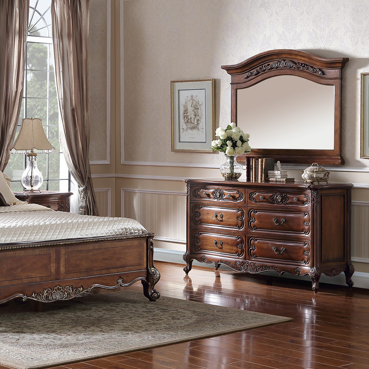 * 浪漫的香頌猶如歷史悠久的杜樂麗花園般,每每散發(fā)著其獨特的韻味。為表現(xiàn)杜樂麗花園的休閑愜意,使用花環(huán)和卷葉造型的實木手工雕刻,配以獨特的拱頂設(shè)計,是經(jīng)典系列香頌法式梳妝鏡的特色。