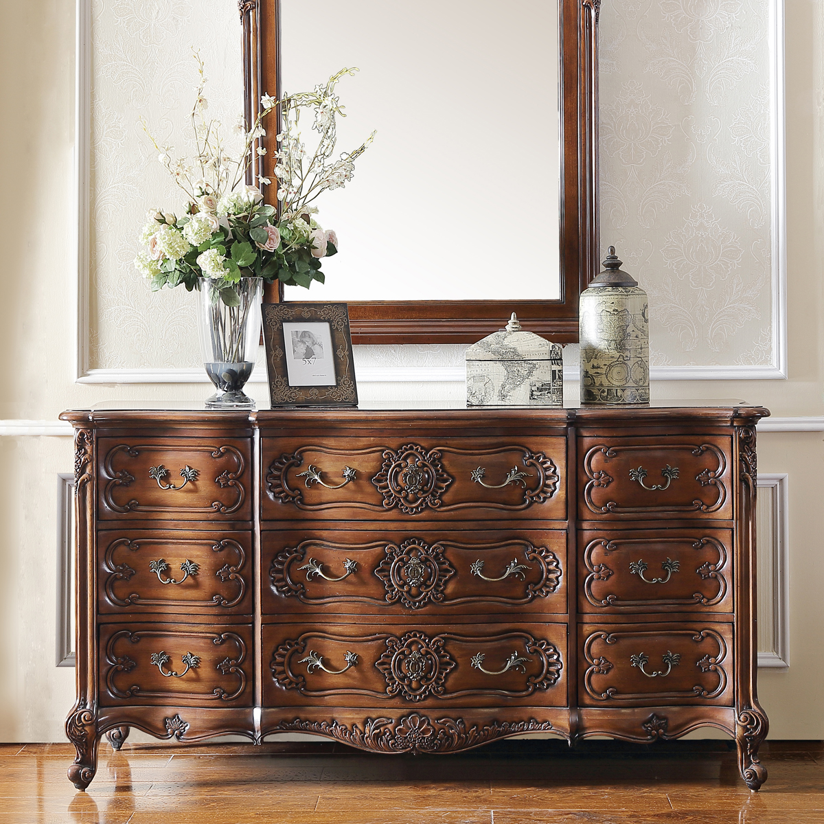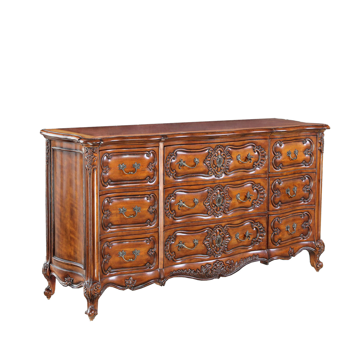 * 手工雕刻的花圃、藤蔓、阿坎瑟斯卷葉雕刻和彎腳設計 * 結實的連接技術 * 設有九個儲物抽斗,中間上首個為翻斗,內可置放電子器材,其余為儲物抽斗;并在其底部采用經典硬木實木滑軌設計