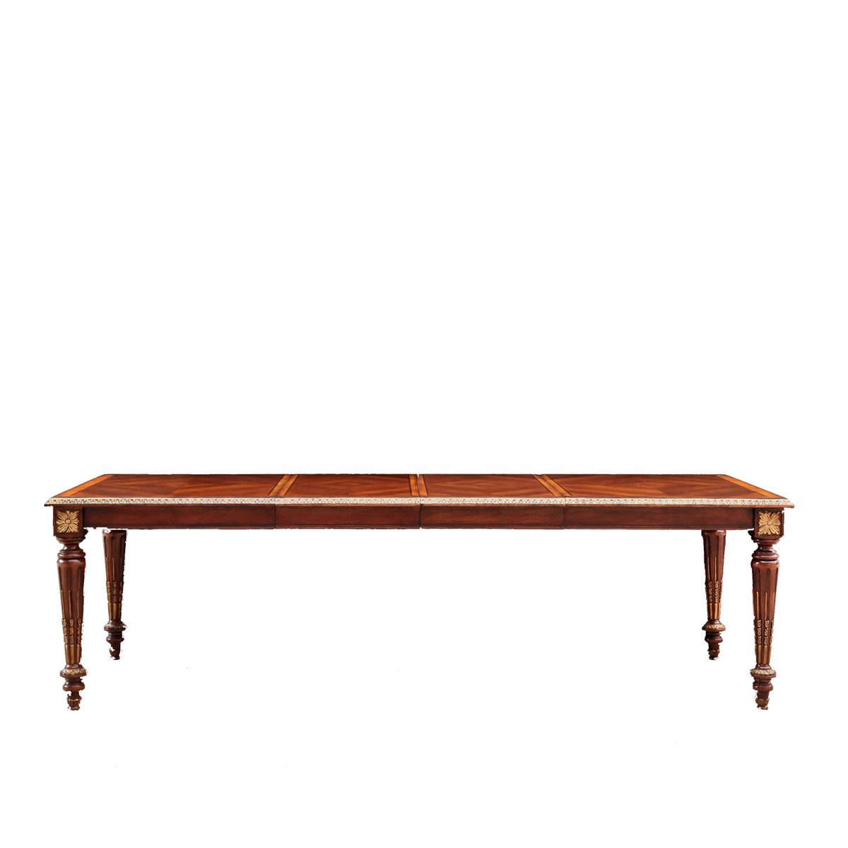 * 為表現法國路易時期的莊嚴和浪漫,以法國凡爾賽宮為設計元素。使用歌頌路易十四時期的太陽花雕刻,顯示其王權穩固地位的錐形腿腳設計;配以鉆石圖案木皮貼面、可調節的伸板設計和貼金工藝,完美演繹了法式宮廷家具的奢華尊貴。