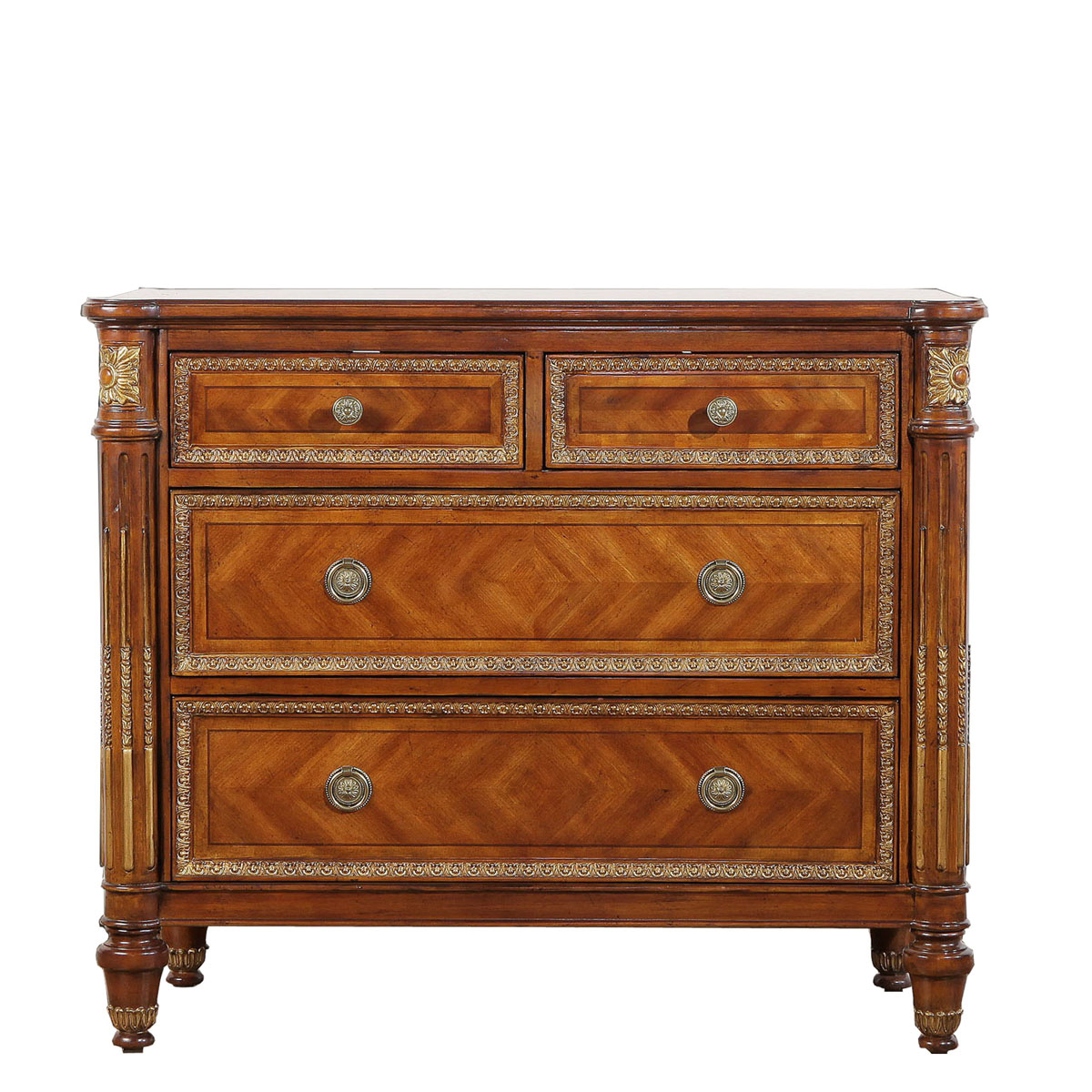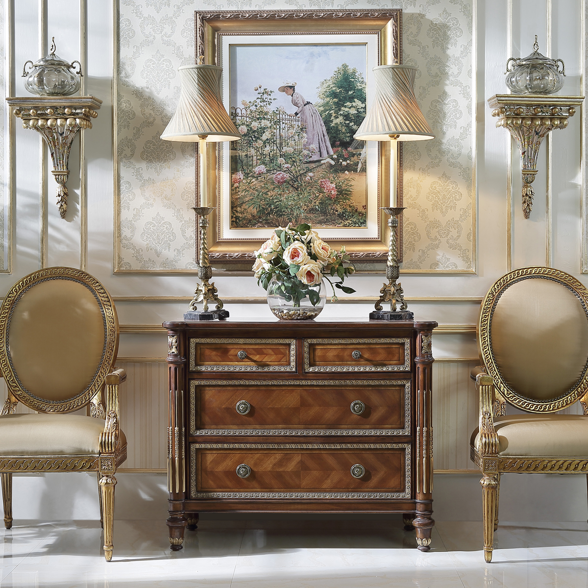 * 為表現法國路易時期的莊嚴和浪漫,以法國凡爾賽宮為設計元素。使用歌頌路易十四時期的太陽花雕刻,顯示其王權穩固地位的錐形腿腳設計,配以建筑柱雕刻與鉆石圖案木皮貼面,完美演繹了法式宮廷家具的奢華尊貴。