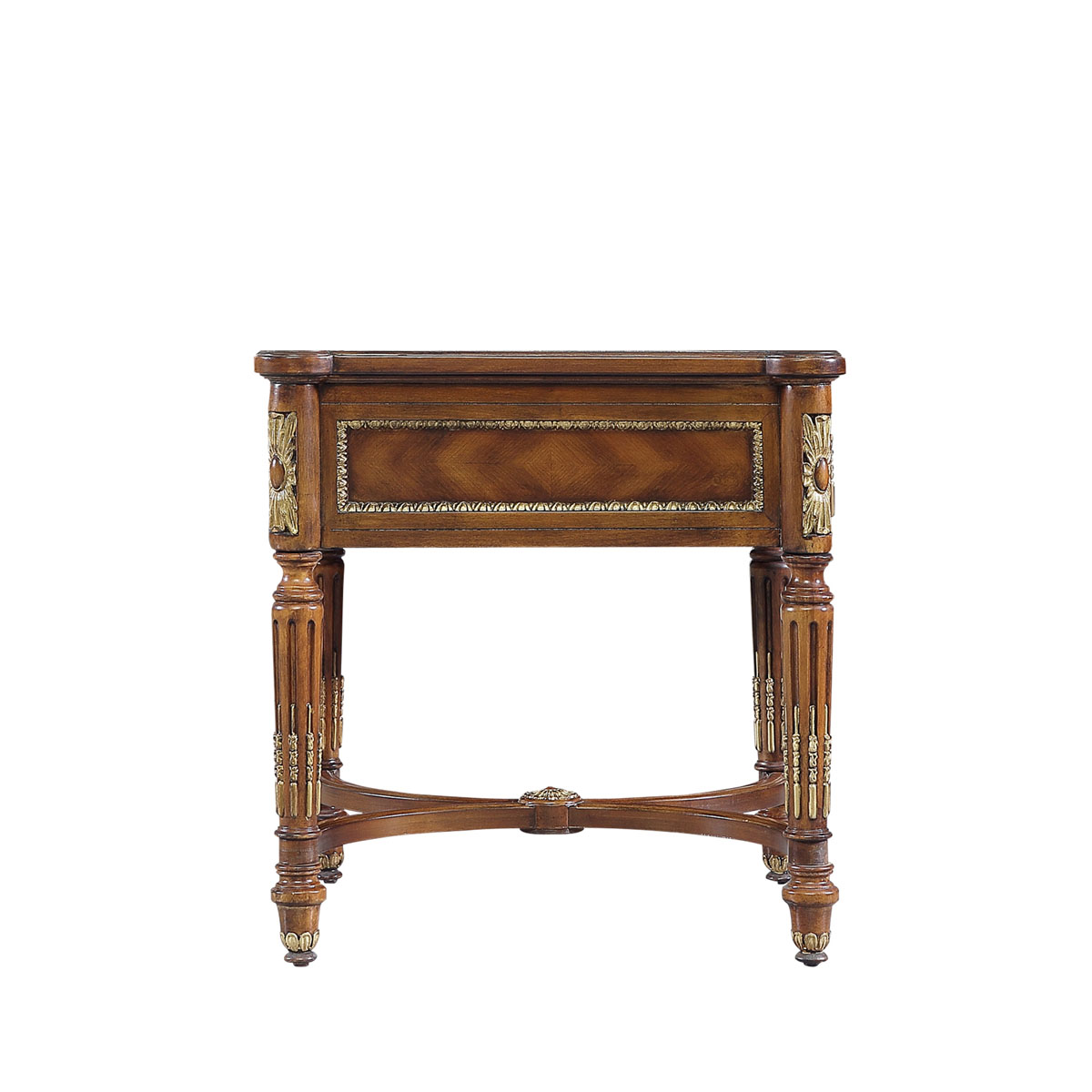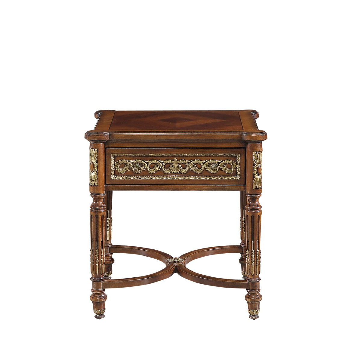 * 為表現(xiàn)法國(guó)路易時(shí)期的莊嚴(yán)和浪漫,以法國(guó)凡爾賽宮為設(shè)計(jì)元素。使用歌頌路易十四時(shí)期的太陽(yáng)花連環(huán)雕刻,顯示其王權(quán)穩(wěn)固地位的錐形腿腳設(shè)計(jì);配以哥特式建筑中的大圓窗骨架設(shè)計(jì)、建筑柱雕刻與絢麗的貼金工藝,完美演繹了法式宮廷家具的奢華尊貴。
