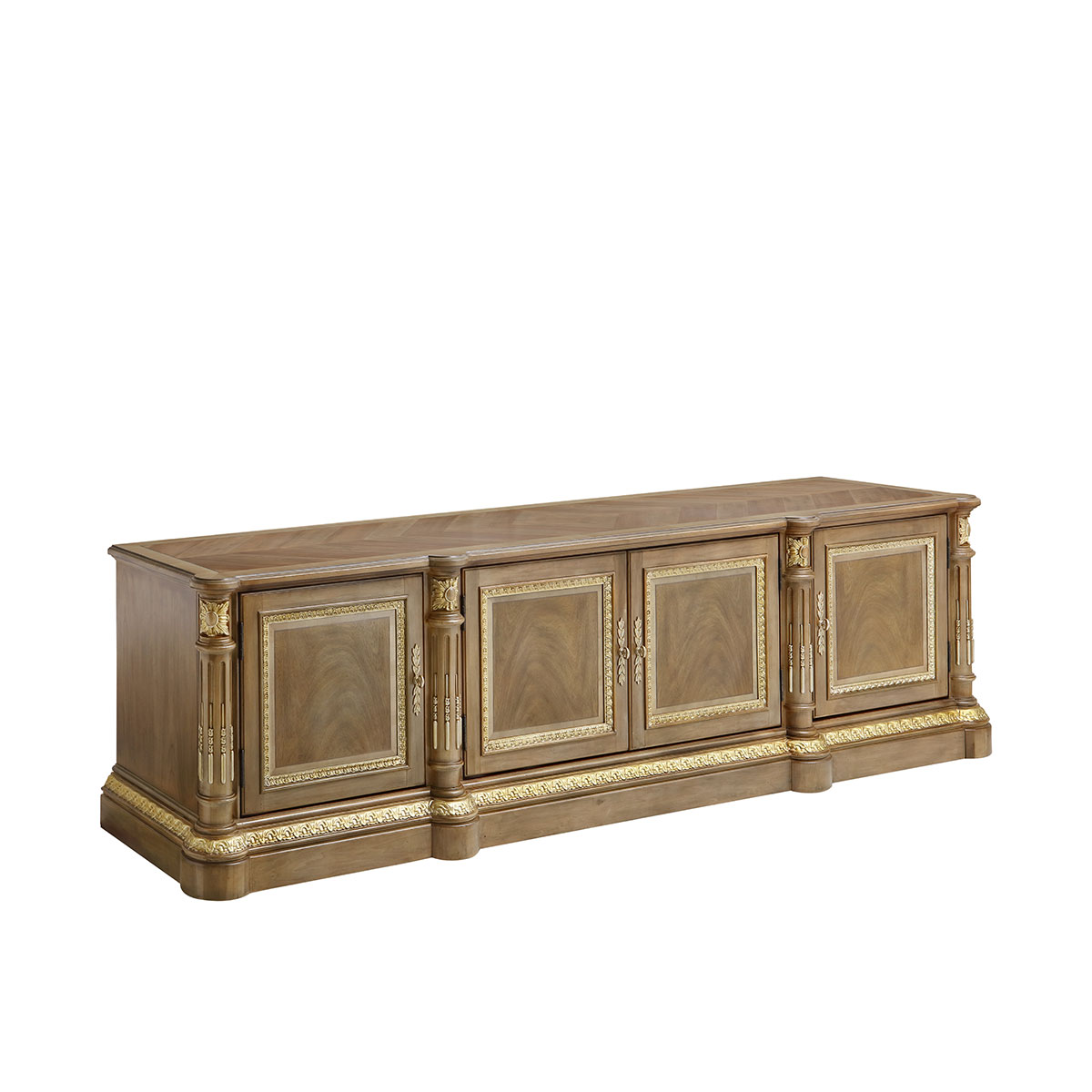 *為表現(xiàn)法國(guó)路易時(shí)期的莊嚴(yán)和浪漫,以法國(guó)凡爾賽宮為設(shè)計(jì)元素。使用歌頌路易十四時(shí)期的太陽花雕刻,優(yōu)雅的黑金色手繪山水畫與鉆石圖案實(shí)木薄片拼貼工藝,完美演繹了法式宮廷家具的奢華尊貴。