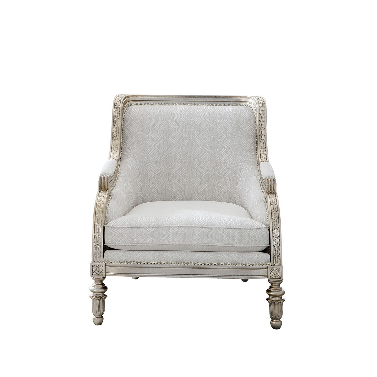 復古而有時尚感的香檳金涂裝,喚醒輕奢時尚;井然有序的雕刻,栩栩如生的花紋裝飾,使它不論從任何角度欣賞,都愈加美不勝收。含苞待放的鈴蘭花雕刻椅腳增添知性的魅力,綻放氣質光彩。