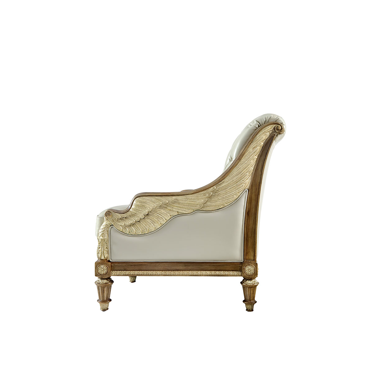 魅影灰邂逅灰褐色,皮質珍奢而不失大氣之姿;設計雕刻出勝利女神-Samothrace翅膀扶手,羽翼豐滿的羽毛雕刻極為精巧經典,援引古典常用的色彩,以簡飾繁;錯落有序的條紋回路蘊藏著達•芬奇的繪畫創作靈感,拉斐爾的建筑設計妙思以及米開朗基羅的雕塑精粹。