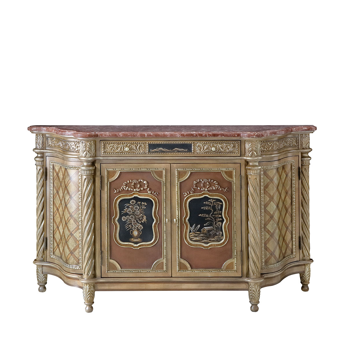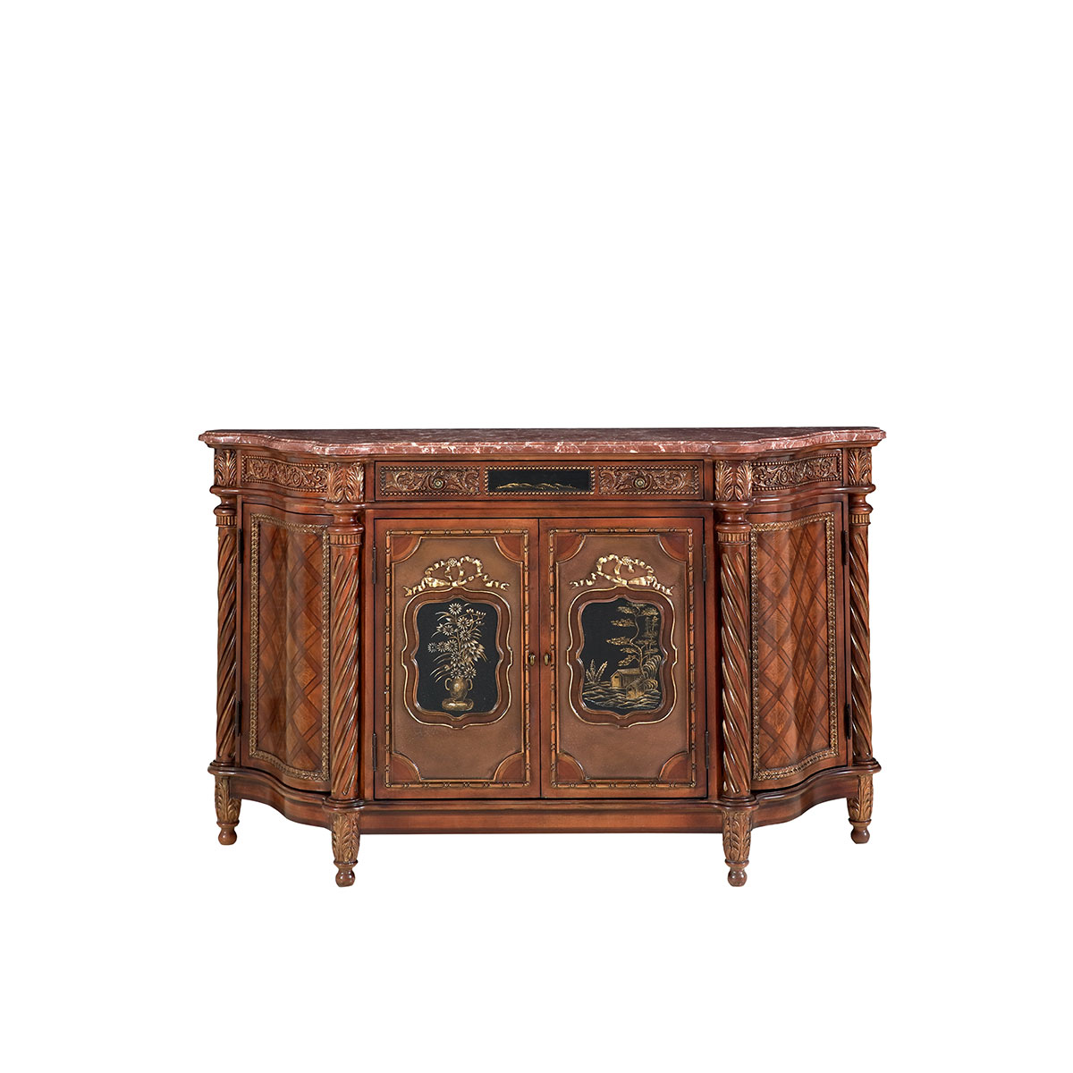 以 Louis XVI (路易十六)時期新古典風格古董櫃為靈感,四平八穩的方形設計配以細膩的雕刻、實木簿片鑲嵌與細膩的手繪工藝,呈現出法國宮廷的浪漫。