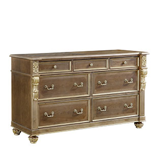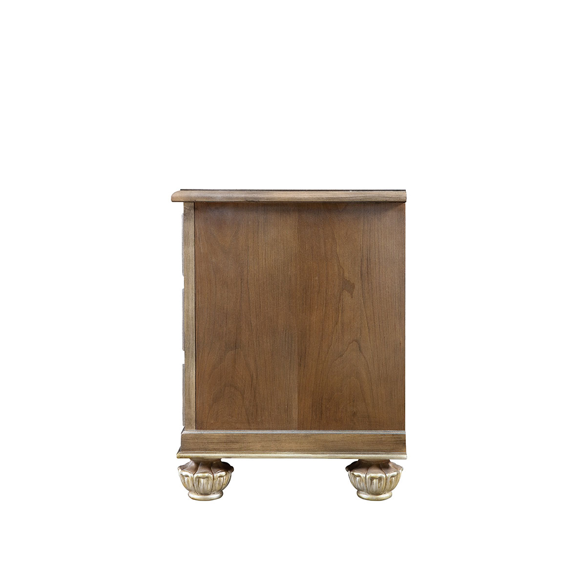 * 手工拼花藤蔓效果,用多種上等木皮拼制而成 * 三個儲物斗,底部采用經典的硬木實木滑軌; * 腳腳底部裝有可調腳釘;