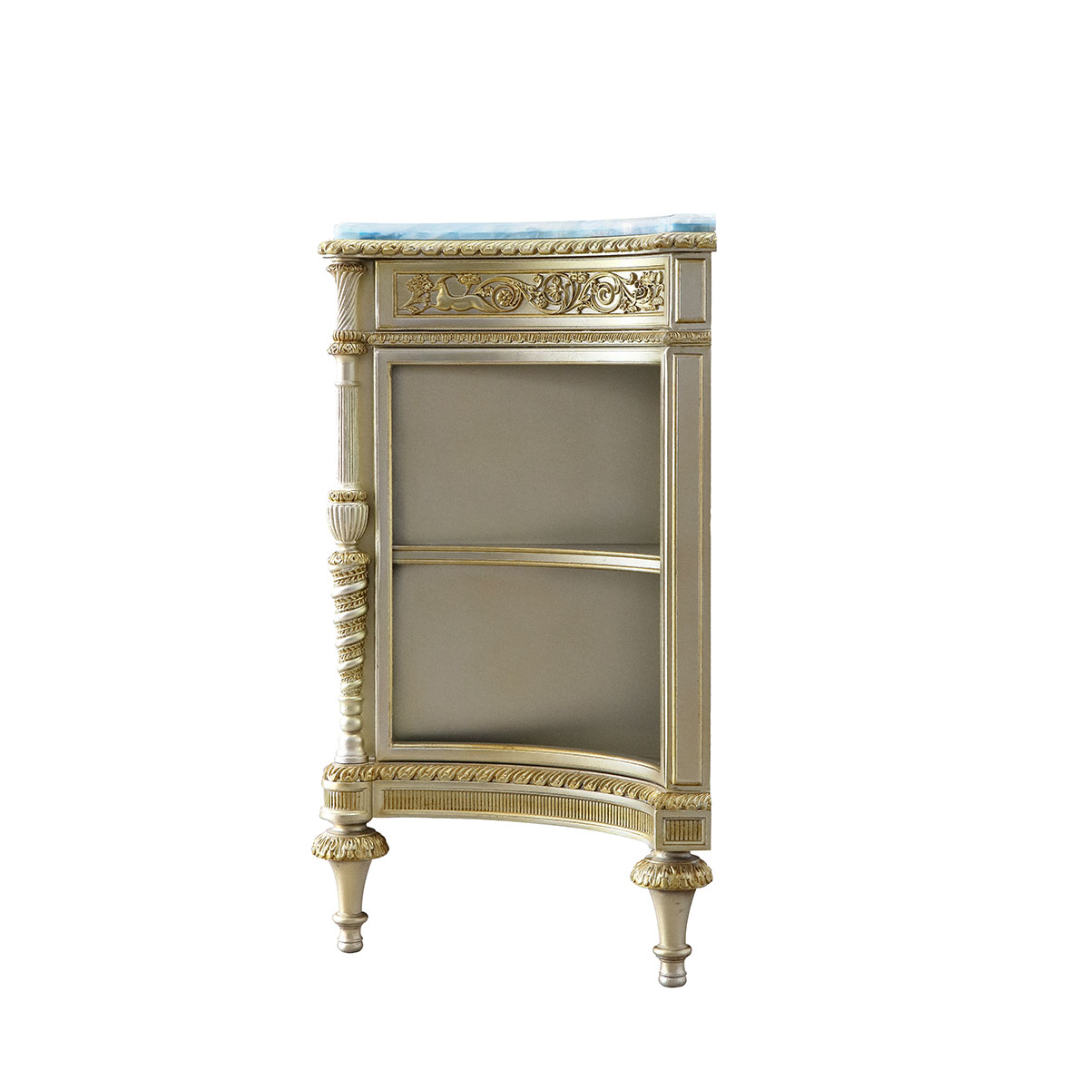 * 這是設計意念來自于英國溫莎堡中安妮女王時期的走廊柜。柜門上的花草彩繪是安妮女王喜歡觀賞園藝的寫照。羅馬短劍裝飾花紋,則表現軍隊的強悍和靈活。配上精致的手工雕刻細節和貼金工藝,是豪華系列溫莎堡英式走廊柜的特色。