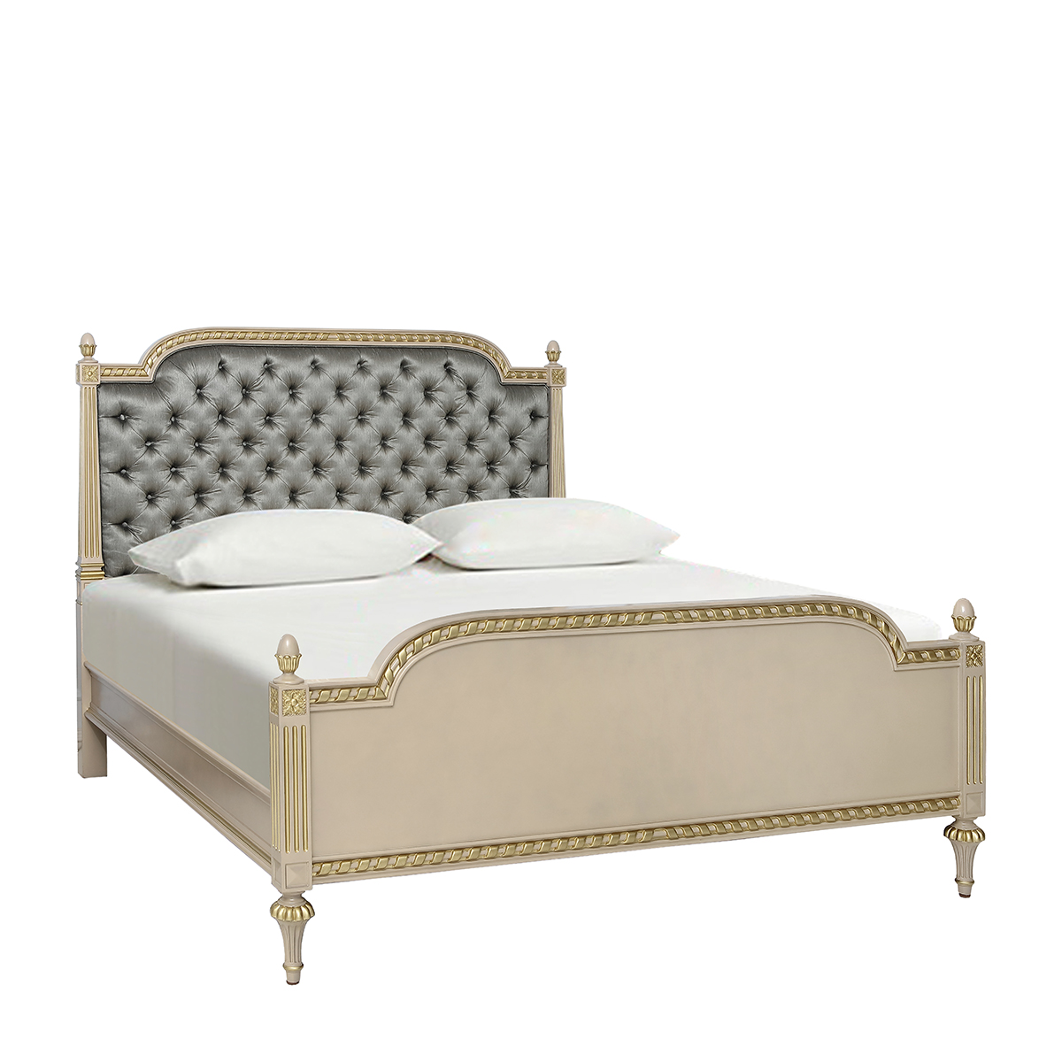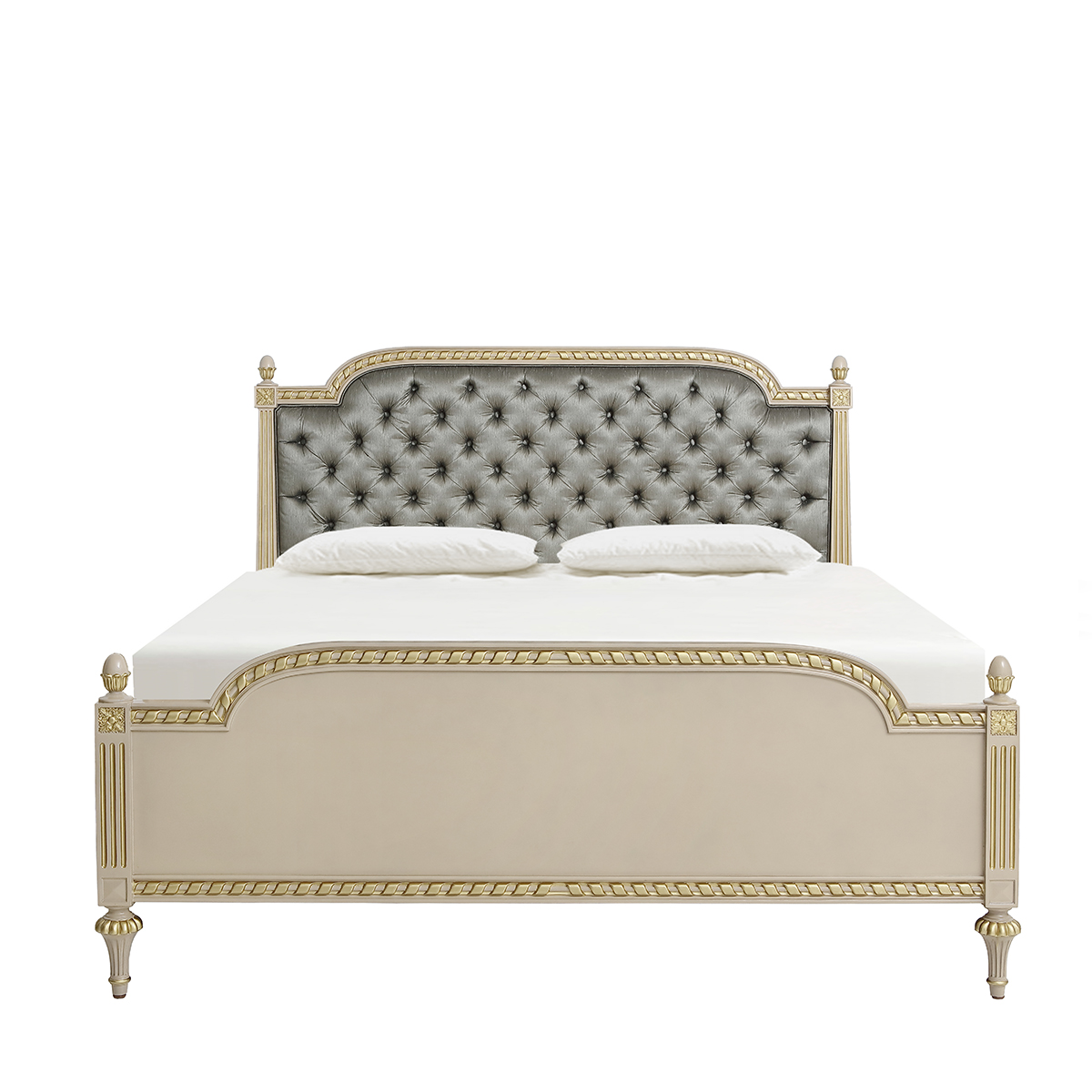普羅旺斯矮柱軟包床藍灰交相輝映,視感醇透明亮而飽含著平靜優雅力量;古舊金屬色調搶眼的裝飾其中,帶起一陣懷舊情愫。簡單的白、古舊的貼仿金箔雕刻與灰藍色配搭,于純凈的氣質中呈現著輕奢的姿態。
