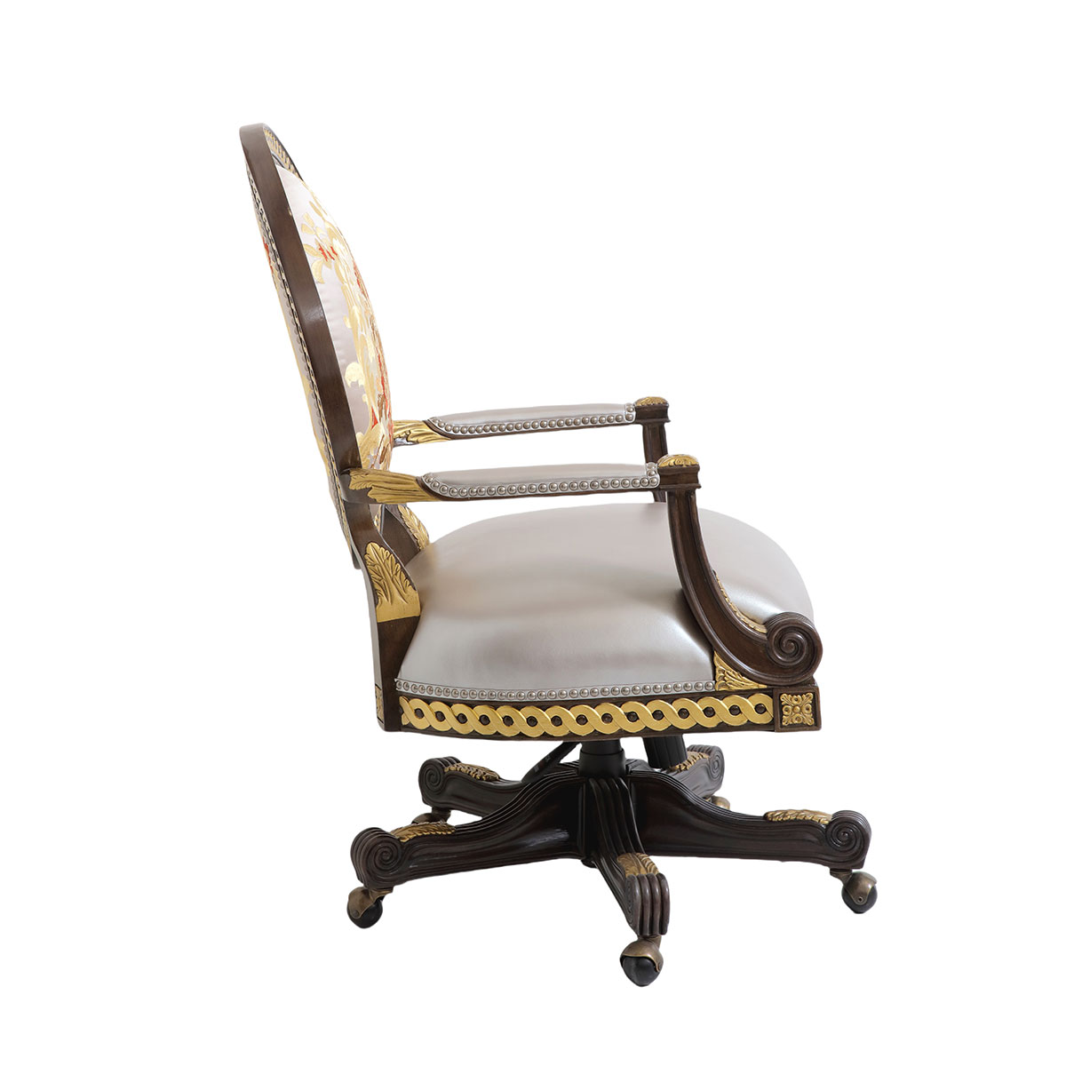 參考18世紀法國路易十六時期涂金扶手椅古董設計,并結合同時期的圓面背板設計。配上精致的連續雕刻和貼金鉑工藝、錐形腳設計、觸感舒適的布藝和包有豐厚的填充物坐墊和靠背。