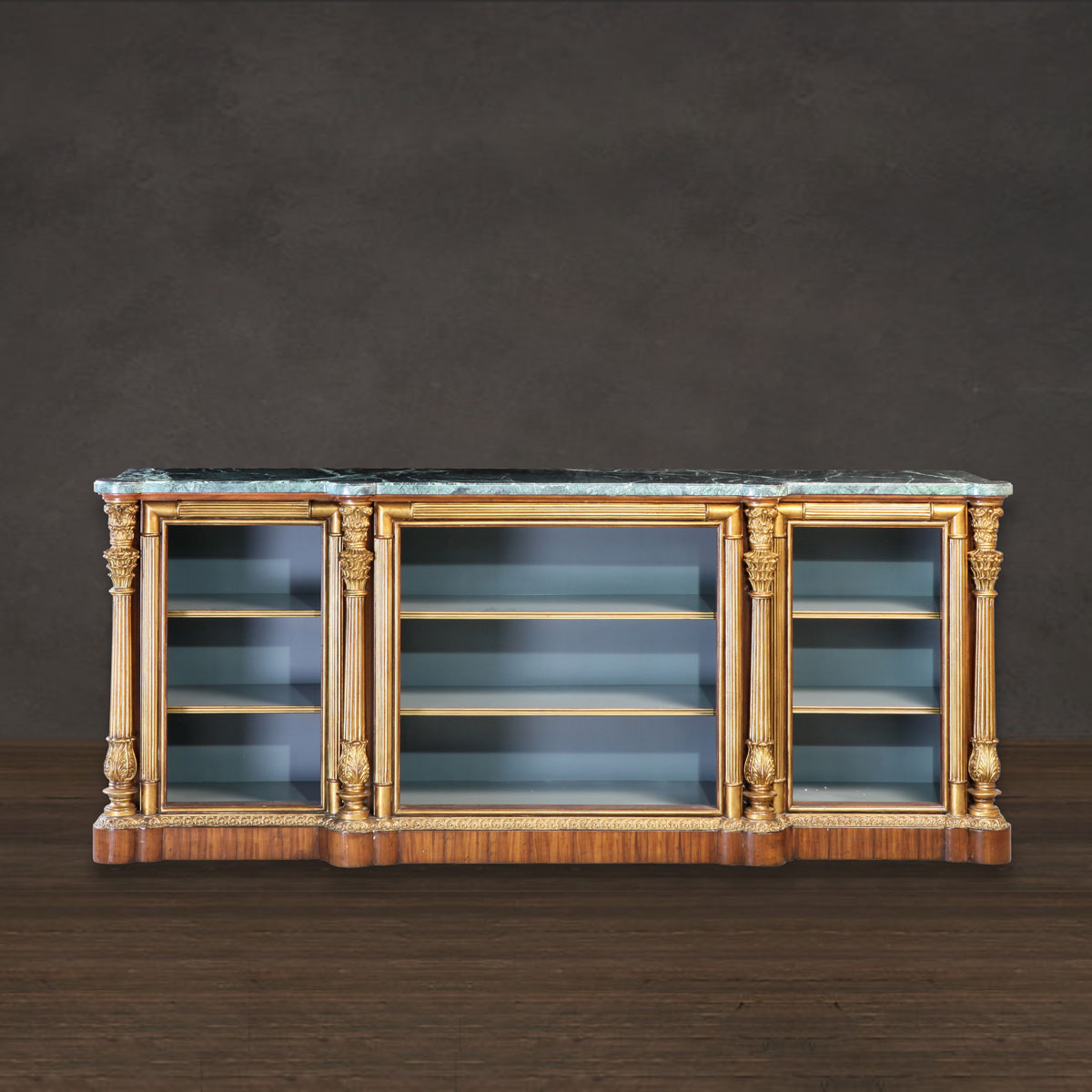 * 這是設計意念來自于英國溫莎堡中喬治三世時期的走廊柜。臺面采用云石做裝飾,借以表達喬治三世王權的堅不可摧。使用以華麗莊嚴的 Corinthian Order(科林斯式羅馬柱)為原型的雕刻柱,配上細膩的木皮貼面和貼金箔工藝,充分展現了英式古董家具的絕世芳華。