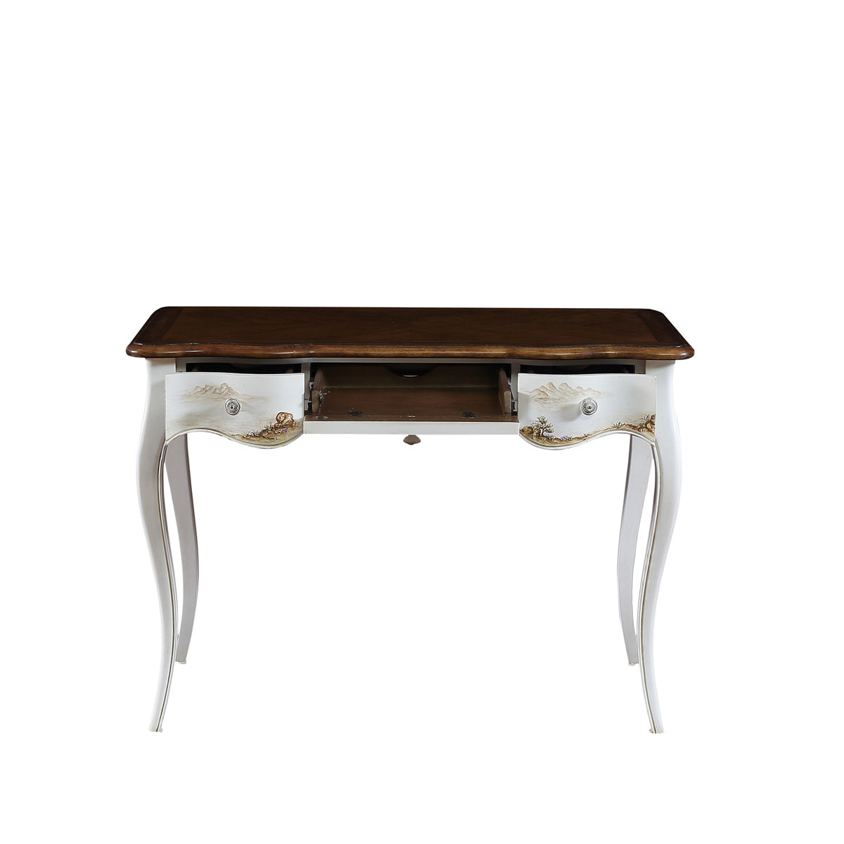 * 在法式仿古白油漆上,手繪上山清水秀的中國山水畫,讓一切都回歸自然的簡潔淡雅;抽屜的線條型設(shè)計與優(yōu)雅的法式彎腳完美契合, 再配以猶如晨陽的實木簿片拼貼工藝, 盡顯普羅旺斯的休閑愜意。