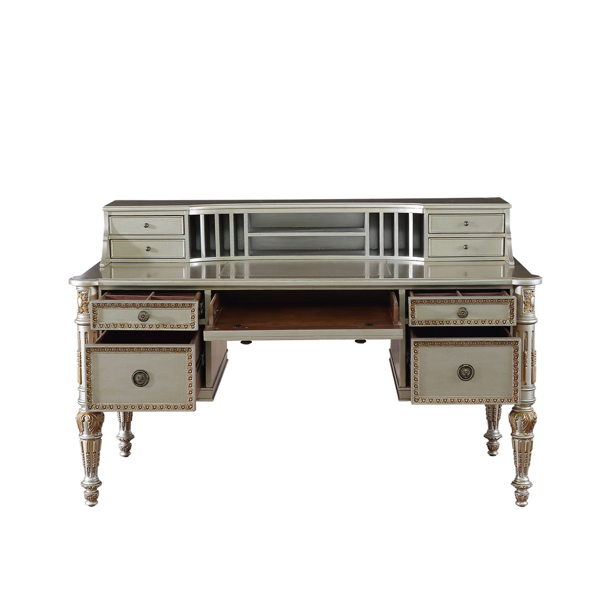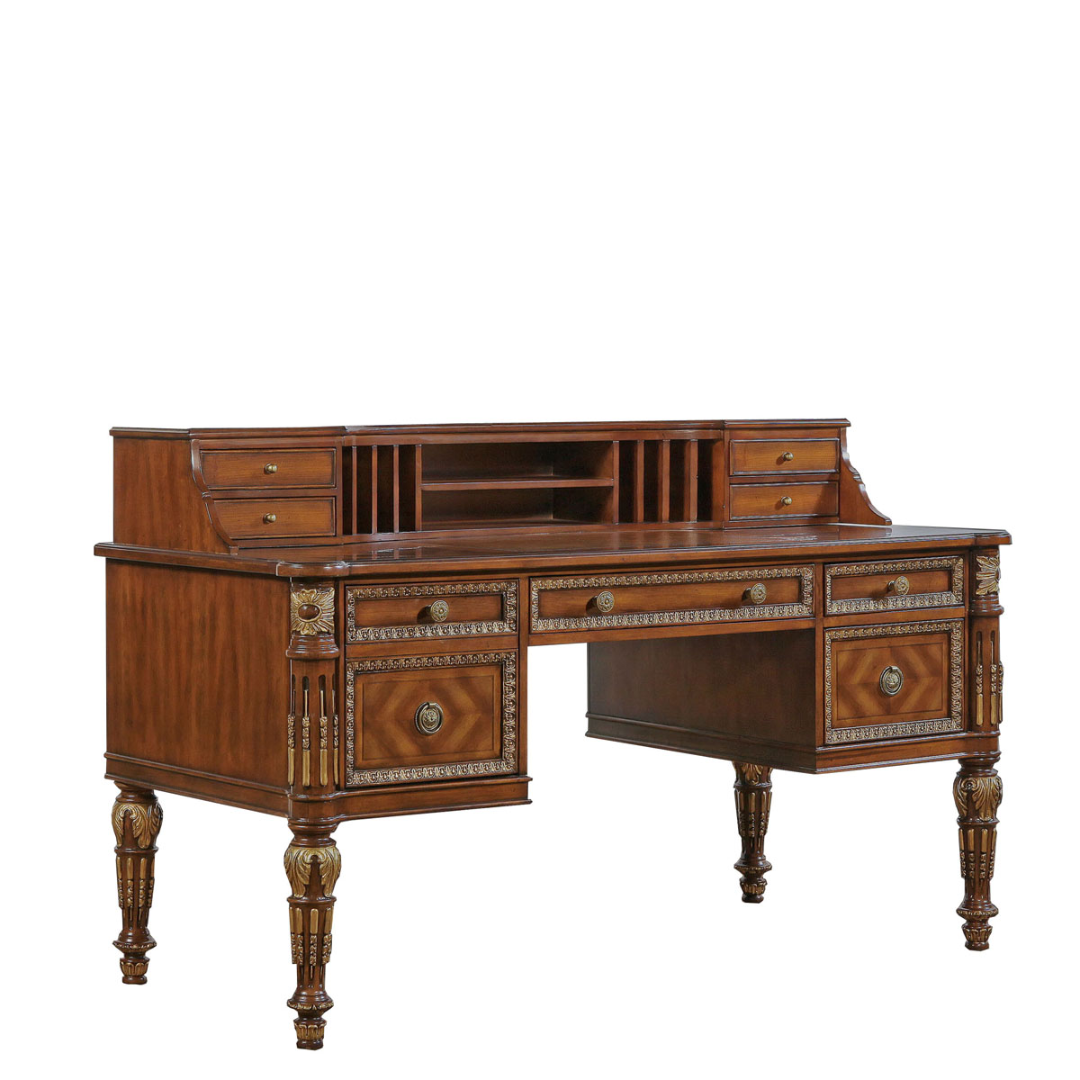 * 手工雕刻的工藝細節; 結實的連接技術; * 可作寫字桌使用,其擁有4個抽斗,上方2個斗可配合鼠標板使用;中央為翻斗,內有線孔,可與鍵盤配合使用; * 桌面有4個小收納抽斗和豎隔板的小空間