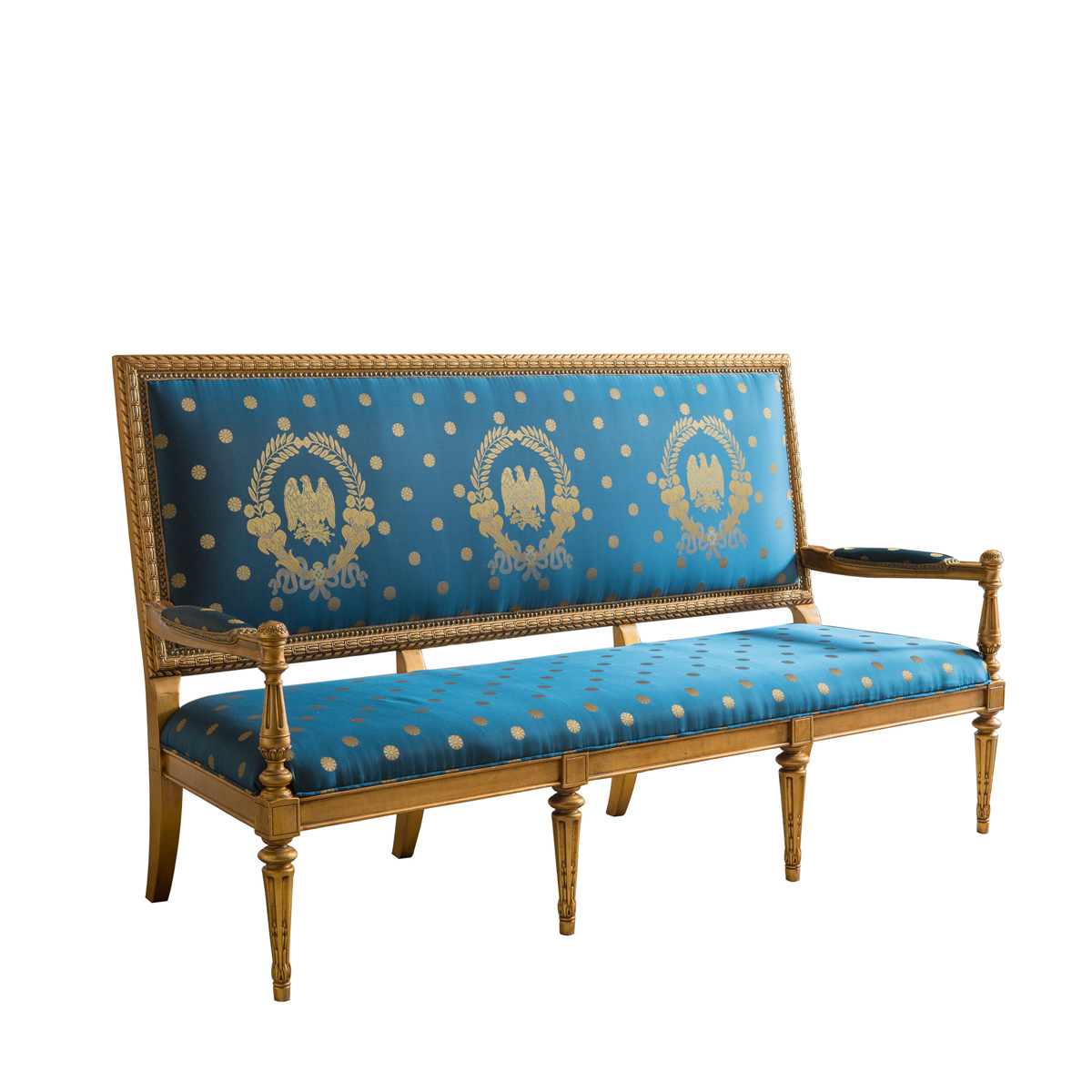 * 這是以美國白宮的Blue Room(藍(lán)色房間) 為意念并結(jié)合法國元素而設(shè)計(jì)的沙發(fā)。包括建筑雕刻錐形腳、 權(quán)杖狀的扶手柱、葉形雕刻外框和貼金鉑工藝,配上代表自由的藍(lán)色布藝和包有豐厚的填充物坐墊和靠背。