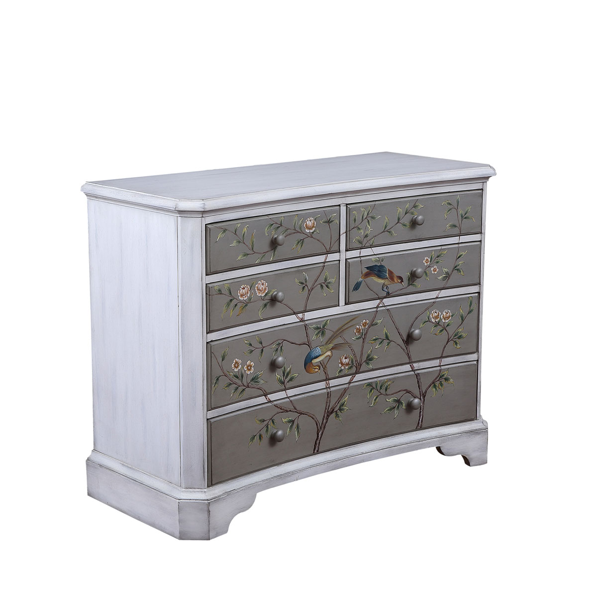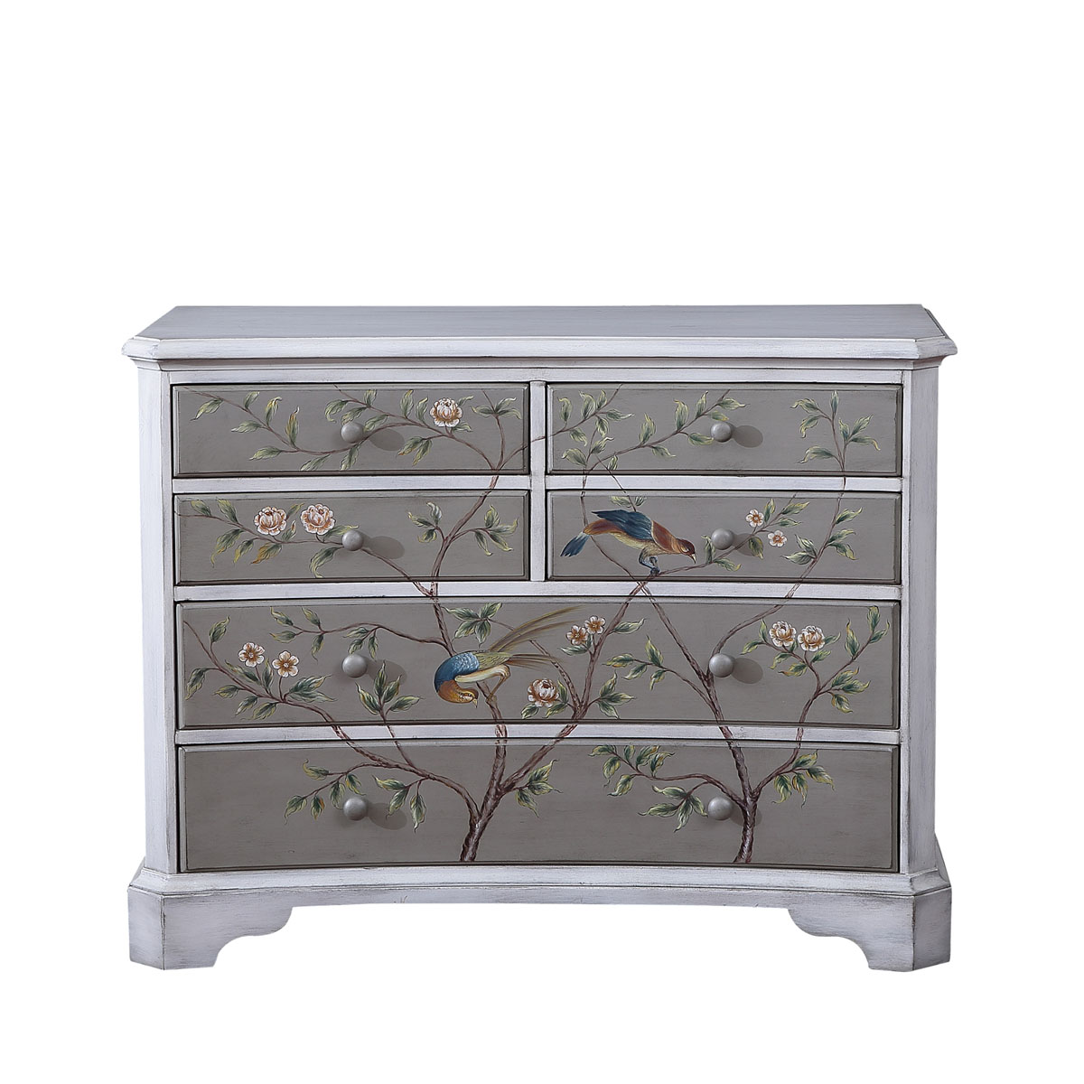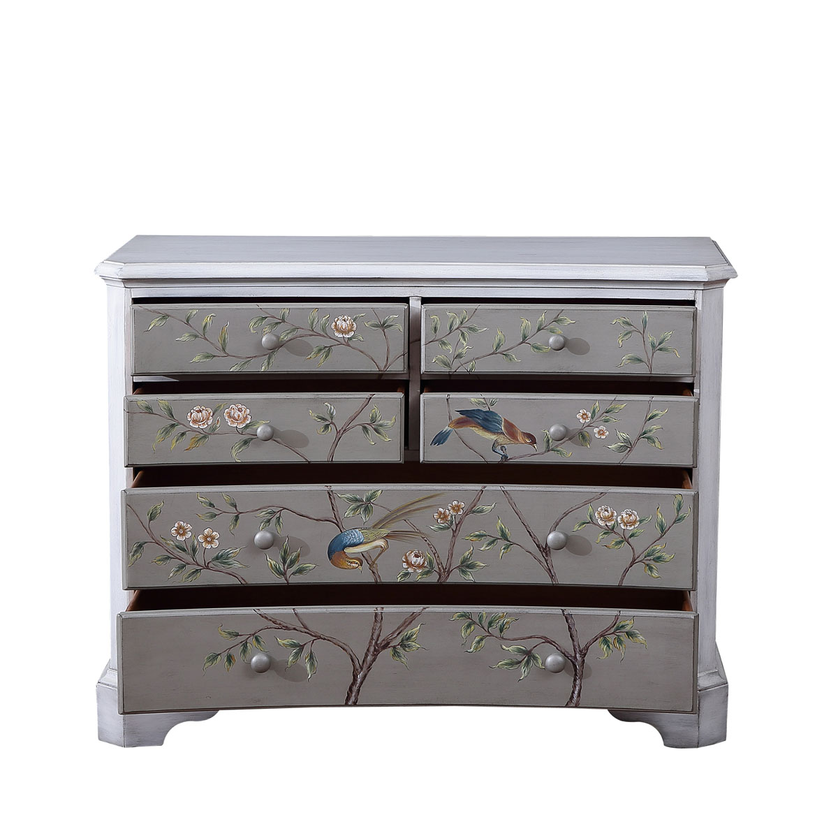 * 花紋圖案都是經(jīng)過專業(yè)工藝師精心繪制而成, 所以每件產(chǎn)品都是獨一無二的; * 6個儲物抽斗,底部采用硬木實木滑軌; * 底部裝有可調(diào)整腳釘;