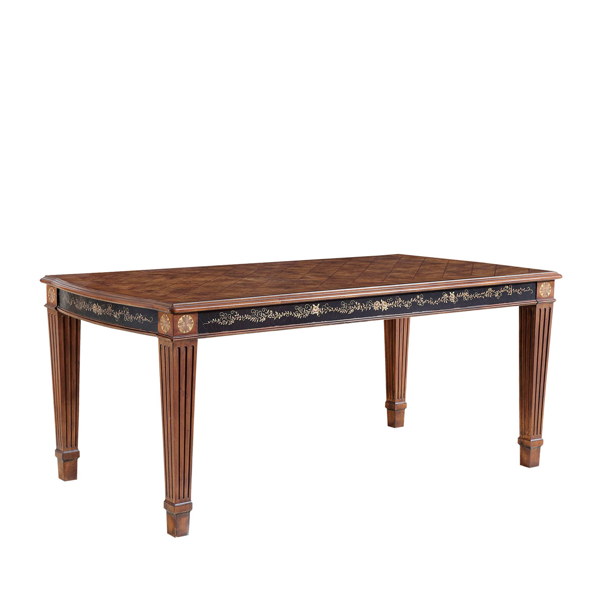 * 采用了喬治王朝后期流行的上粗下細帶槽紋方形腿,結合略帶弧度的線條與雅致的木皮貼面,將英式家具在新古典時期的芳容身姿展露無遺。
