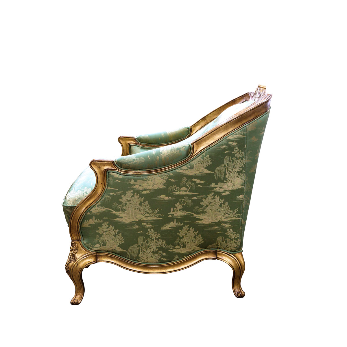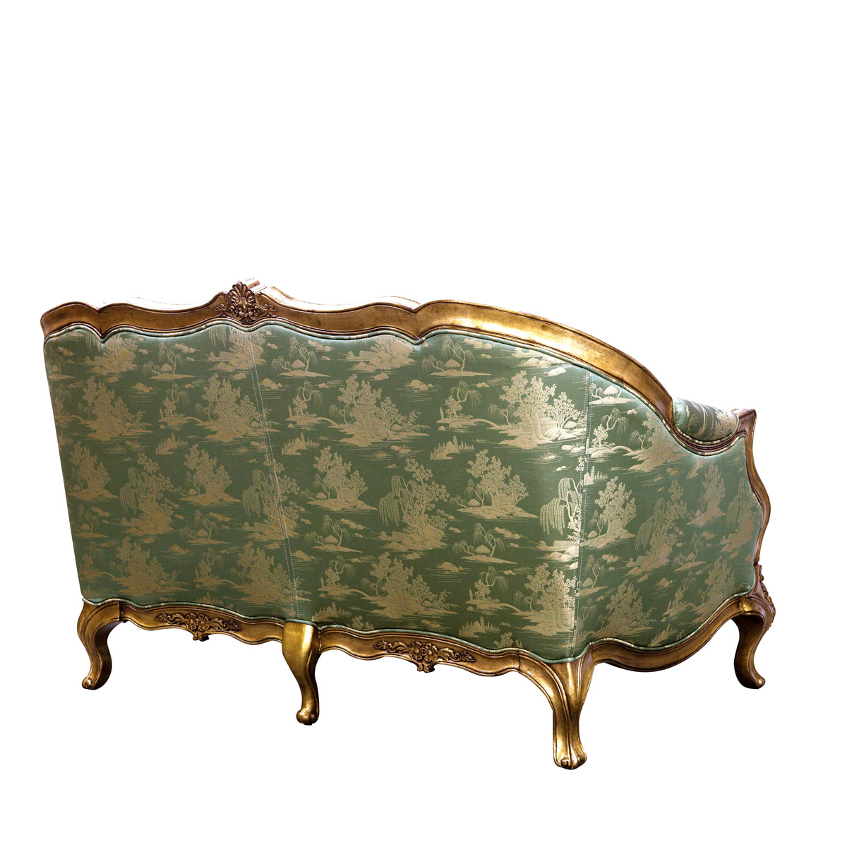 * 從法國十八世紀初攝政時期的風格中汲取靈感制作而成,采用了同風格的彎腳設計,阿坎瑟斯葉雕刻造型和金箔貼飾,再飾以中國山水圖案的絲綢和包有豐厚的填充物坐墊和靠背,使得這款沙發閃耀著華麗高貴的光環;