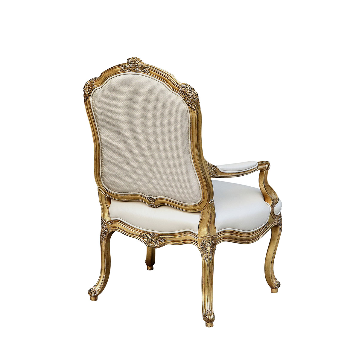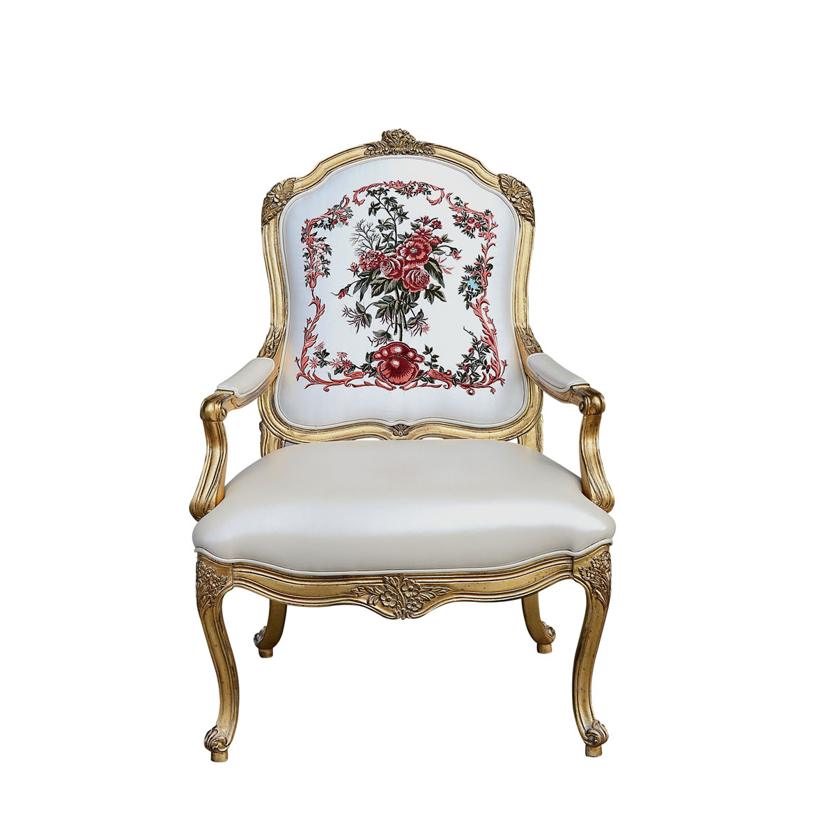 * 以 Louis VX (路易十五)時期洛可可式涂金古董扶手椅為設計靈感,華麗的曲線輪廓配以細膩的雕刻,呈現出法國宮廷的浪漫。不對稱設計的花型布藝設計,更是把洛可可風格的美表達得淋漓盡致。