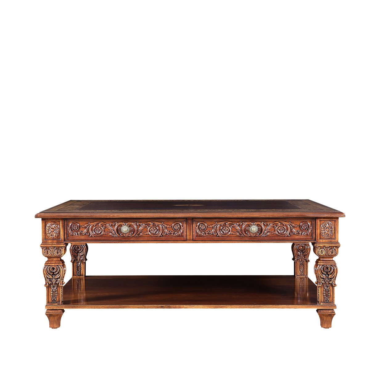 * 以現位于美國白宮中象征友誼和權力的堅毅桌(英語:Resolute desk)為設計意念, 以實木拼貼和雕刻工藝,將具有紀念意義的歷史時刻融入其中,實用性的功能設計更是把藝術和生活完美結合, 是宮廷系列華盛頓美式咖啡臺的特色。