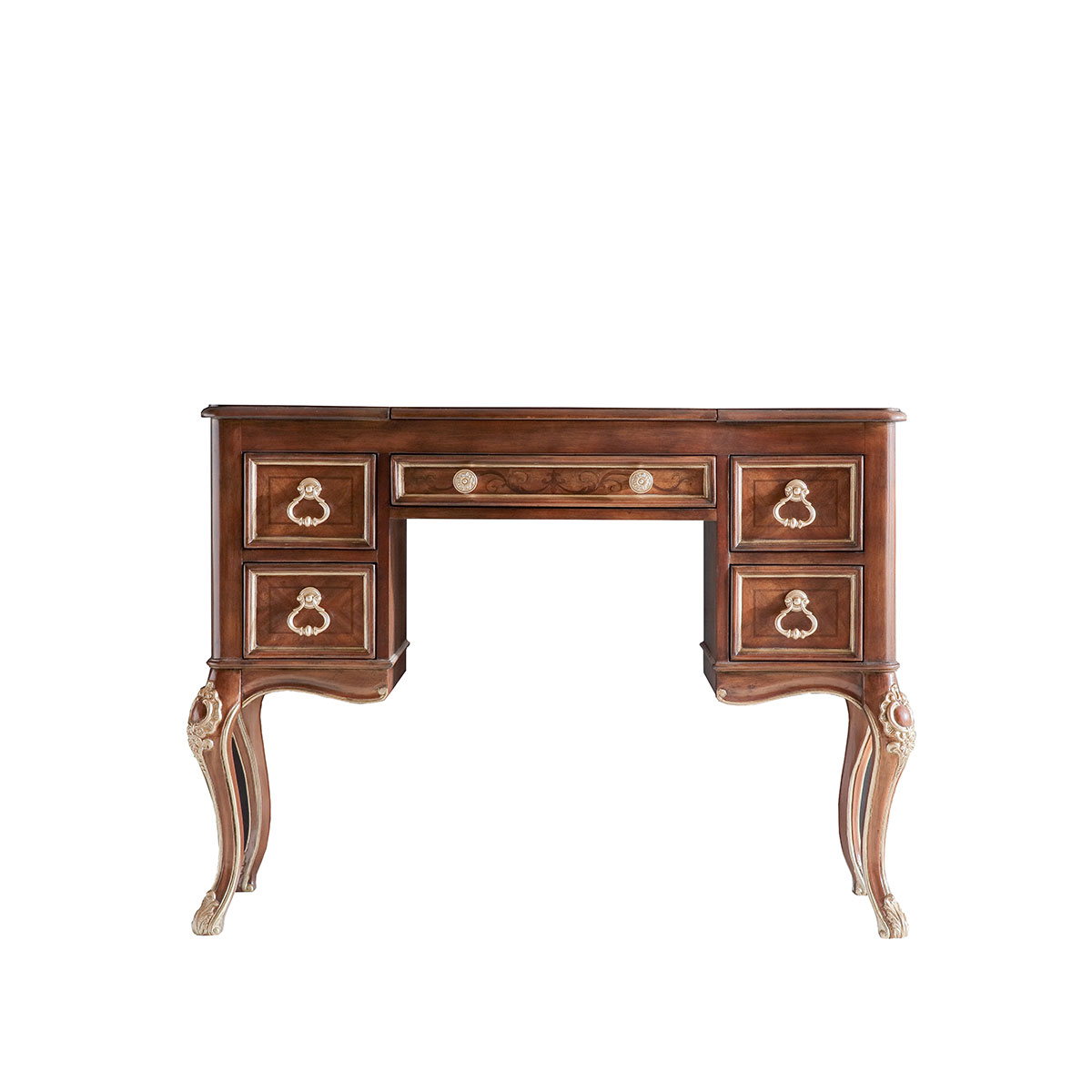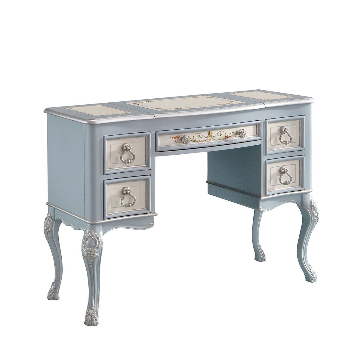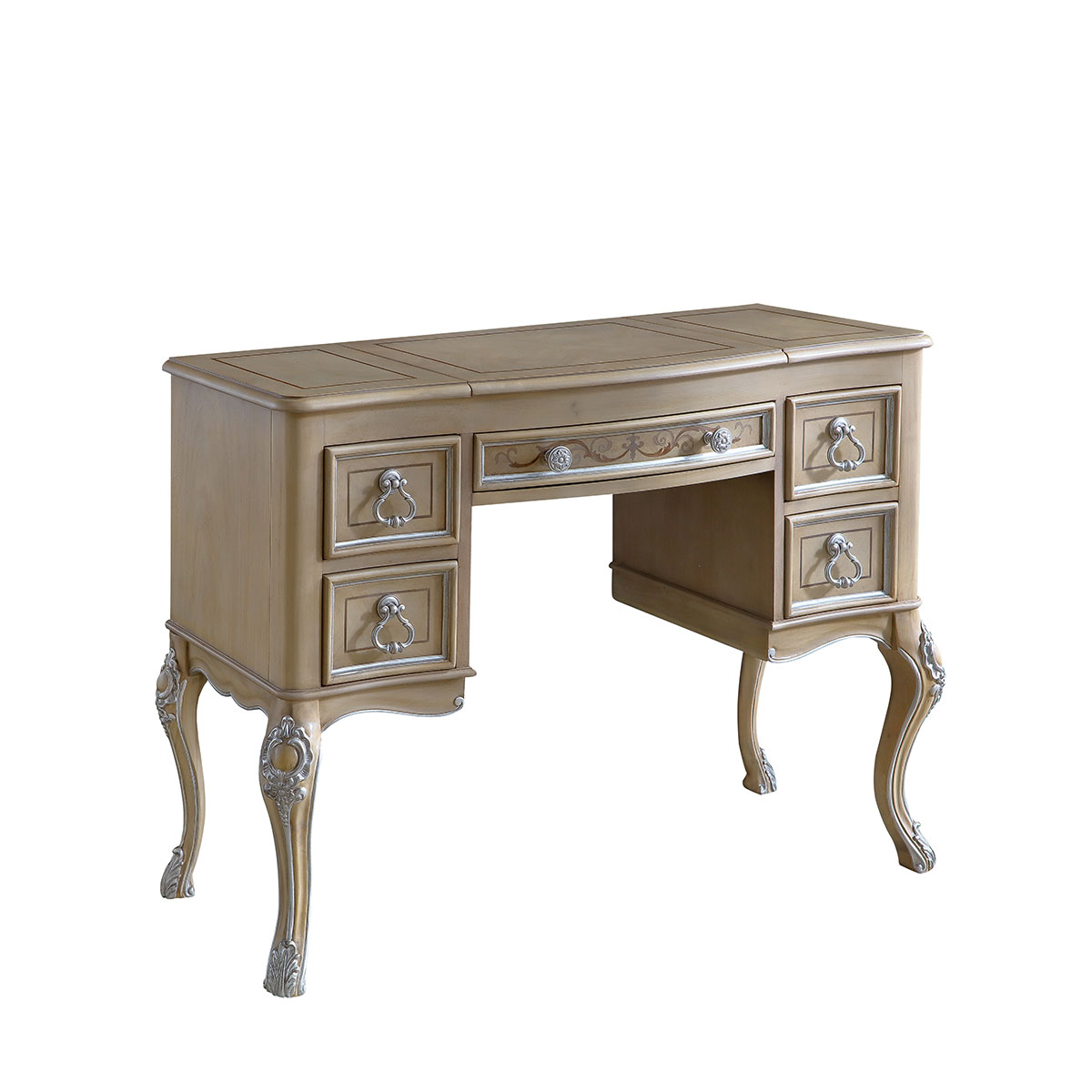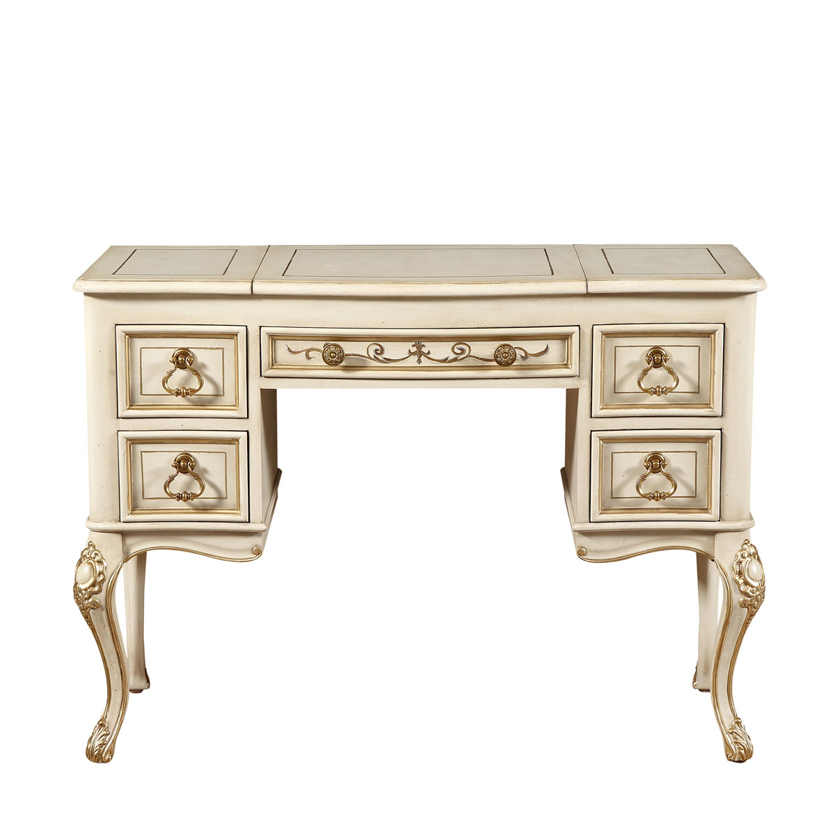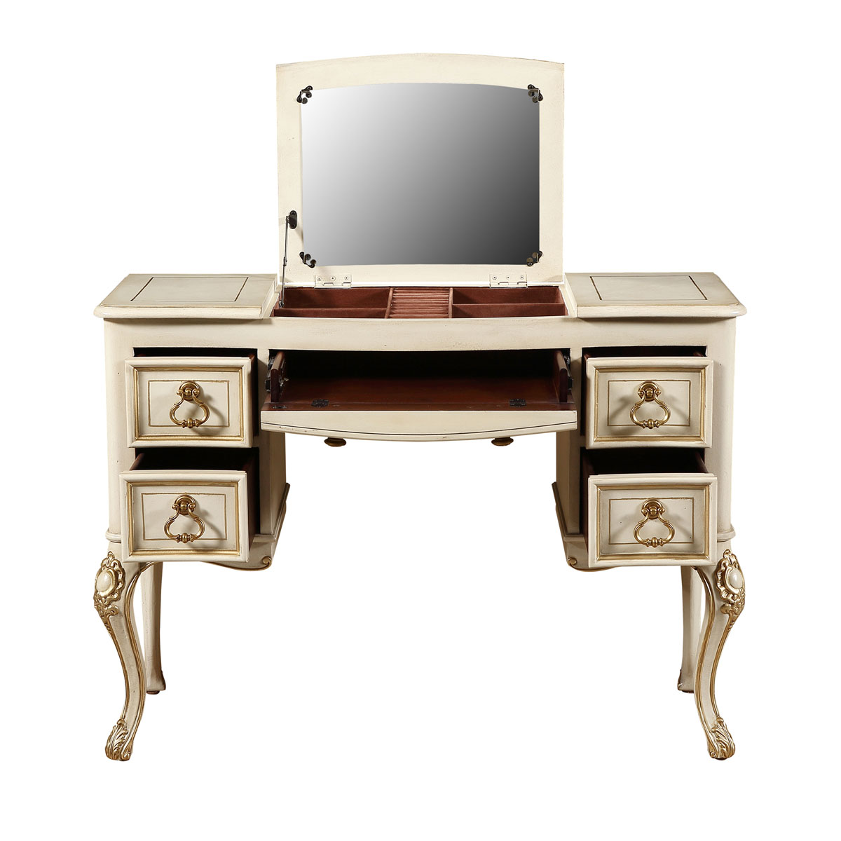 * 四個(gè)儲(chǔ)物抽斗,底部采用硬木實(shí)木滑軌.中間抽斗的設(shè)計(jì)可翻下斗面,用來(lái)放置鍵盤(pán),抽斗內(nèi)側(cè)有電線孔,抽斗兩邊裝有兩條三節(jié)消聲鐵滑軌,滑順耐用; * 中間面板可打開(kāi),里面有鏡子和絨布戒指格; * 腳底部裝有可調(diào)腳釘