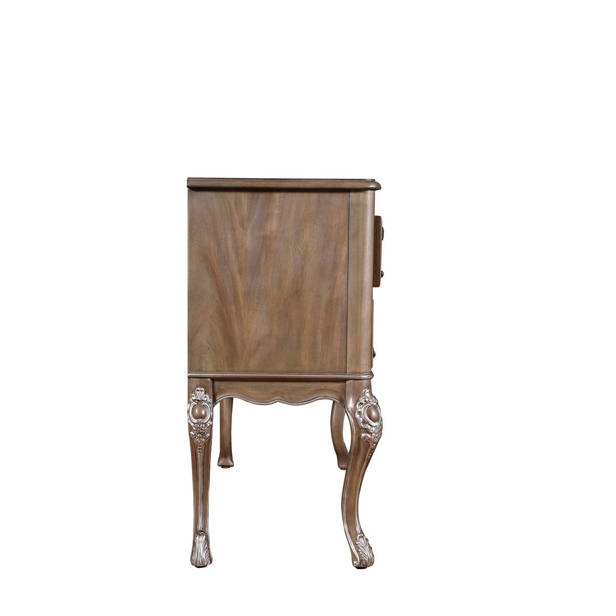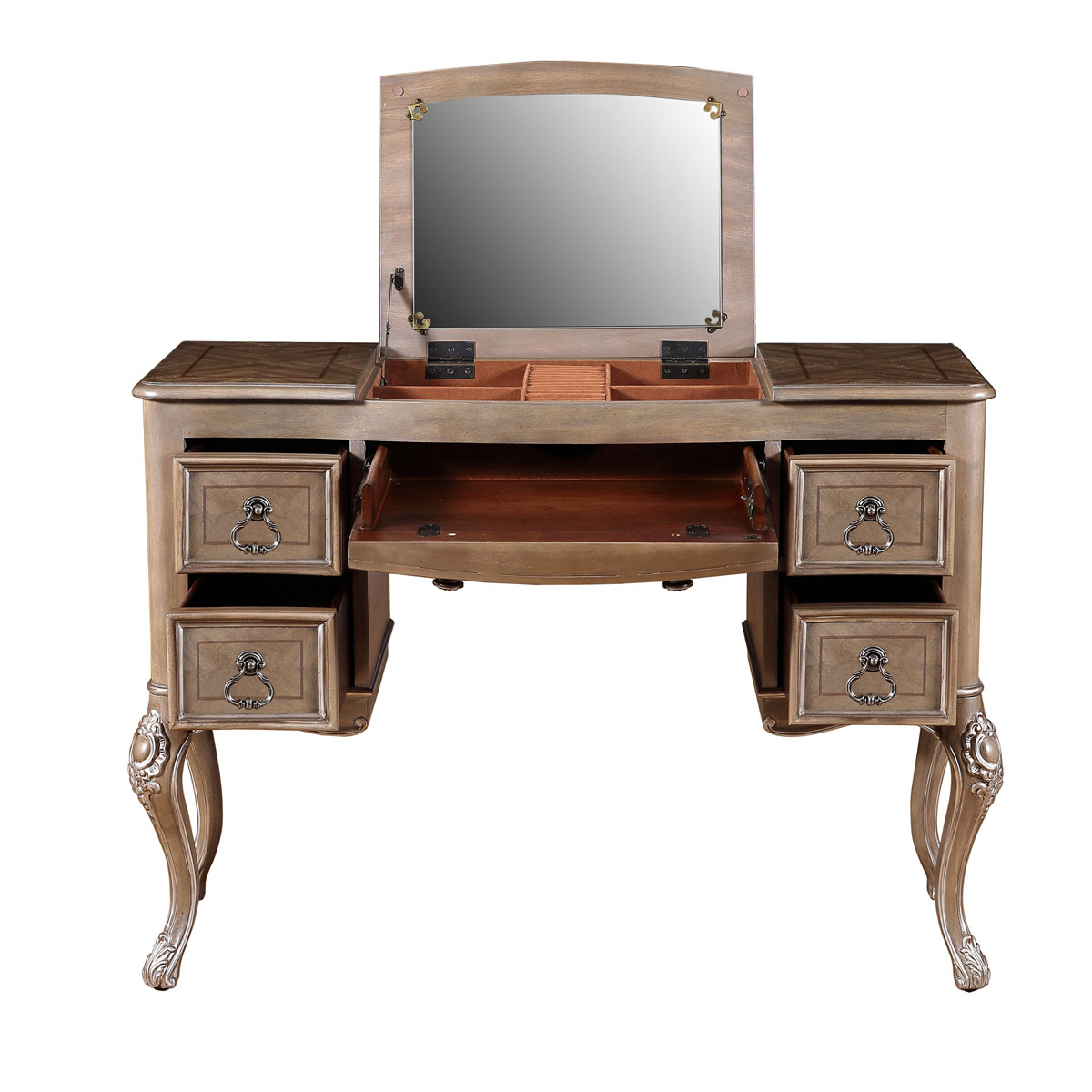 * 四個(gè)儲(chǔ)物抽斗,底部采用硬木實(shí)木滑軌.中間抽斗的設(shè)計(jì)可翻下斗面,用來(lái)放置鍵盤,抽斗內(nèi)側(cè)有電線孔,抽斗兩邊裝有兩條三節(jié)消聲鐵滑軌,滑順耐用; * 中間面板可打開,里面有鏡子和絨布戒指格; * 腳底部裝有可調(diào)腳釘