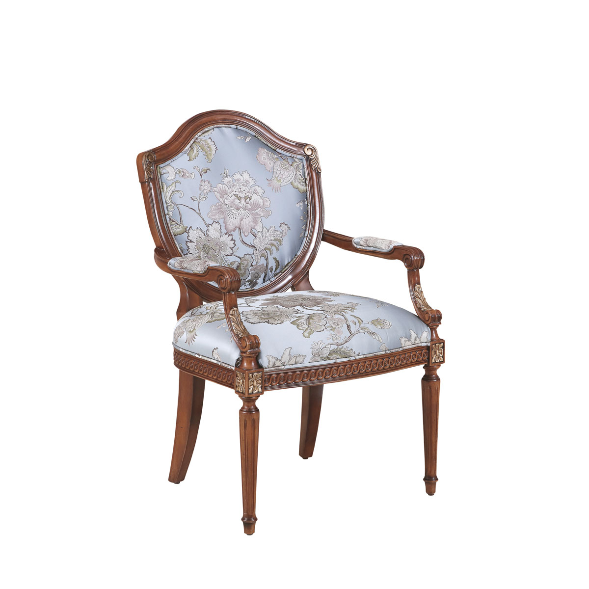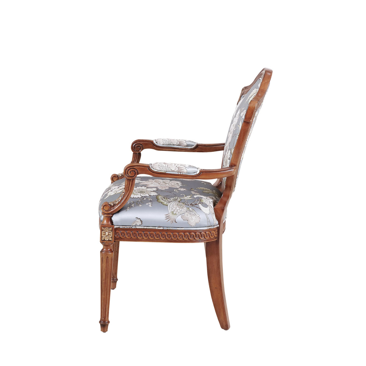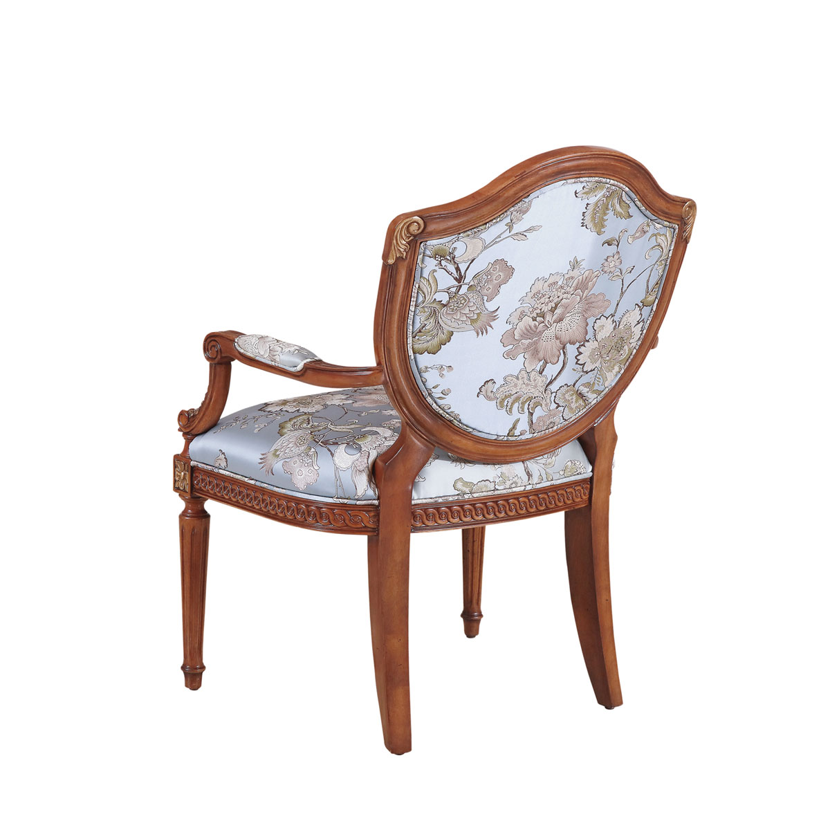 法國新古典和洛可可風格,盾型椅背造型簡約大方,建筑柱雕刻柱腿簡約的直線條造型,端莊大氣,花草藤蔓雕刻及印花布藝生機蔓延,充滿法國田園的自然氣息。
