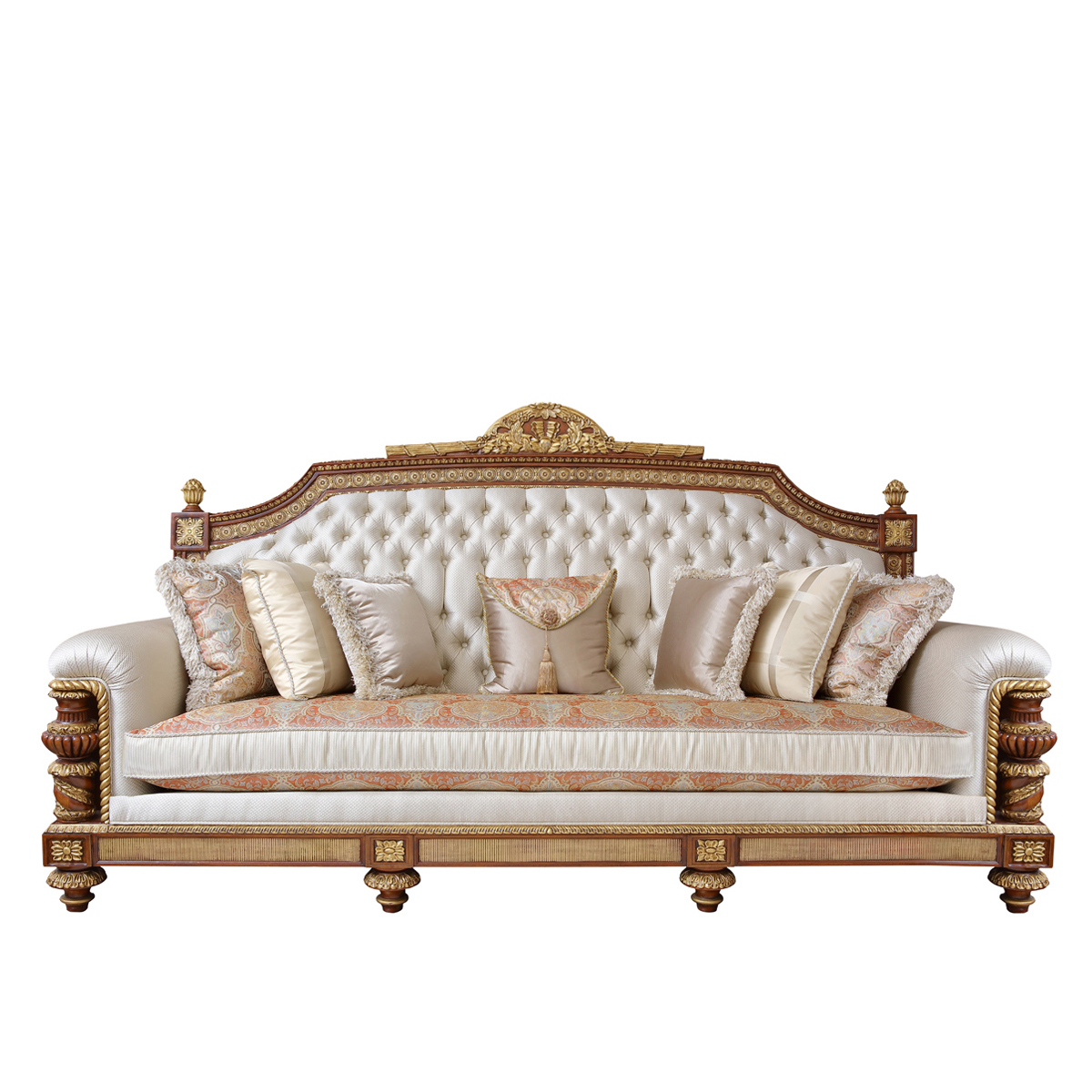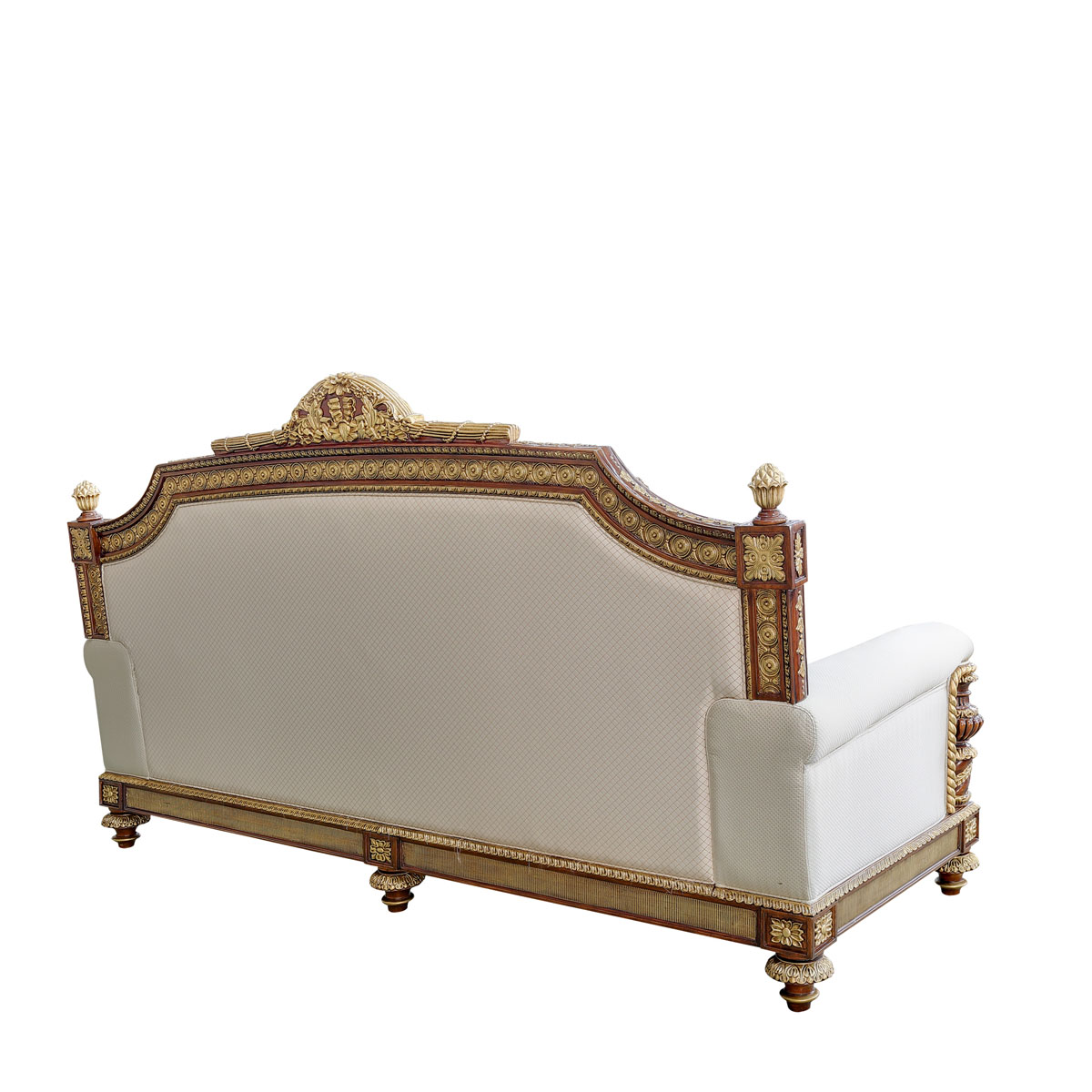 * 以英國(guó)溫莎城堡中喬治四世時(shí)期的臥床為設(shè)計(jì)意念,使用皇家御用的桃花心木為主要材質(zhì),配以精致的雕刻和貼金工藝,表達(dá)英國(guó)皇室尊貴的地位。同時(shí)使用舒適的軟包和柔順的布藝,使藝術(shù)和生活結(jié)合,表達(dá)英國(guó)君王客廳應(yīng)有的品質(zhì),是溫莎堡系列英式沙發(fā)的特色。